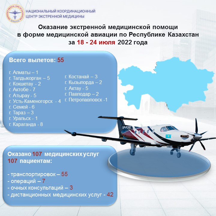 Оказание экстренной медицинской помощи в форме медицинской авиации по Республике Казахстан за 18-24 июля 2022 года