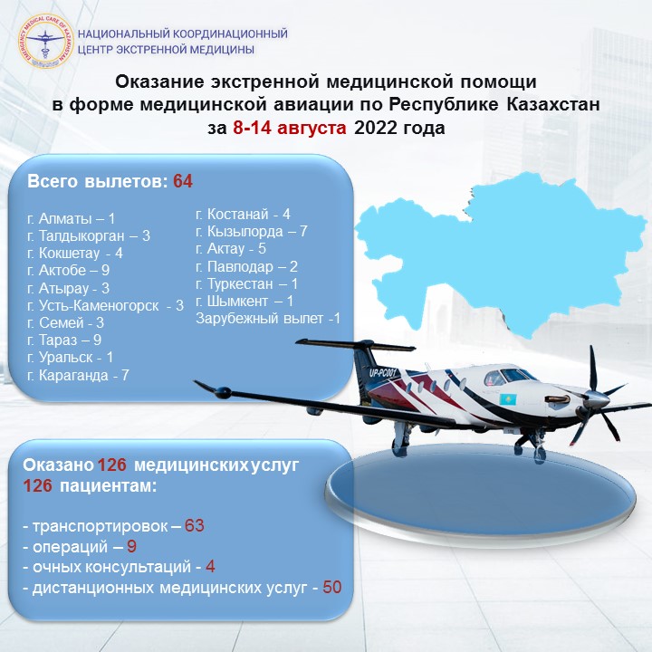 Оказание экстренной медицинской помощи в форме медицинской авиации по Республике Казахстан за 8-14 августа 2022 года