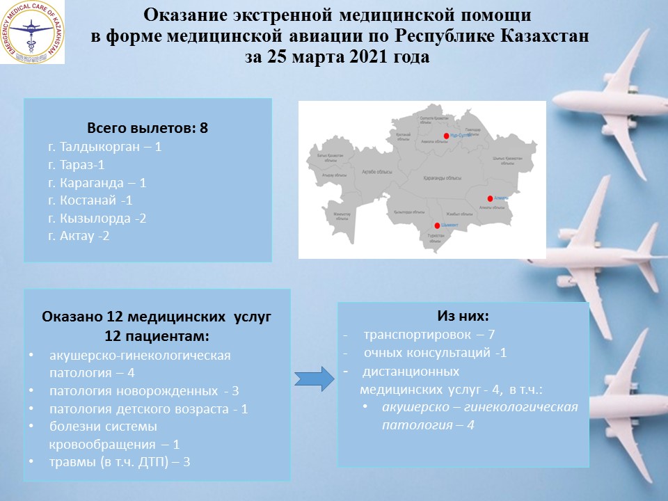 Оказание экстренной медицинской помощи в форме медицинской авиации по Республике Казахстан за 25 марта 2021 года