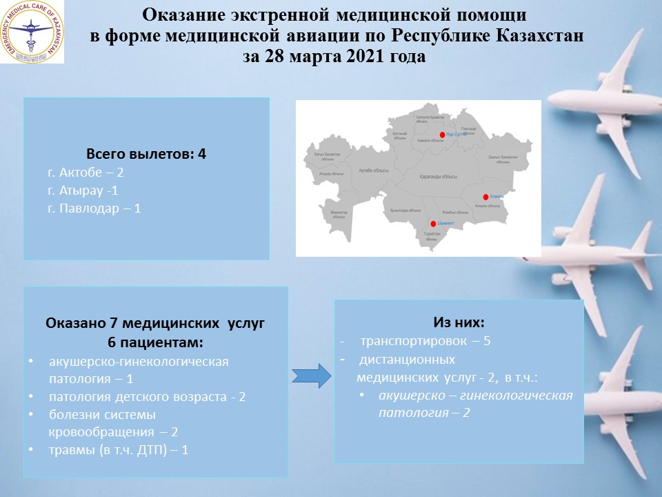 Оказание экстренной медицинской помощи в форме медицинской авиации по Республике Казахстан за 28 марта 2021 года