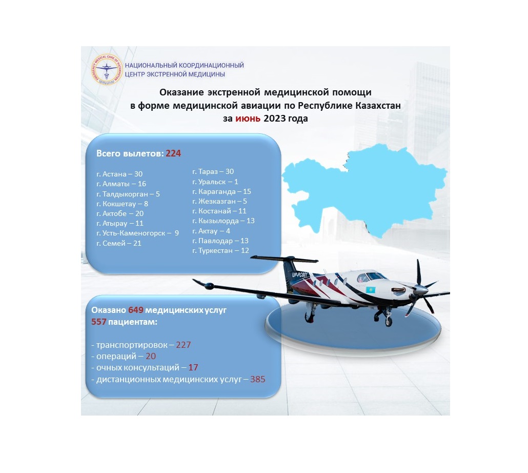 Оказание экстренной медицинской помощи в форме медицинской авиации по Республике Казахстан за июнь 2023 года