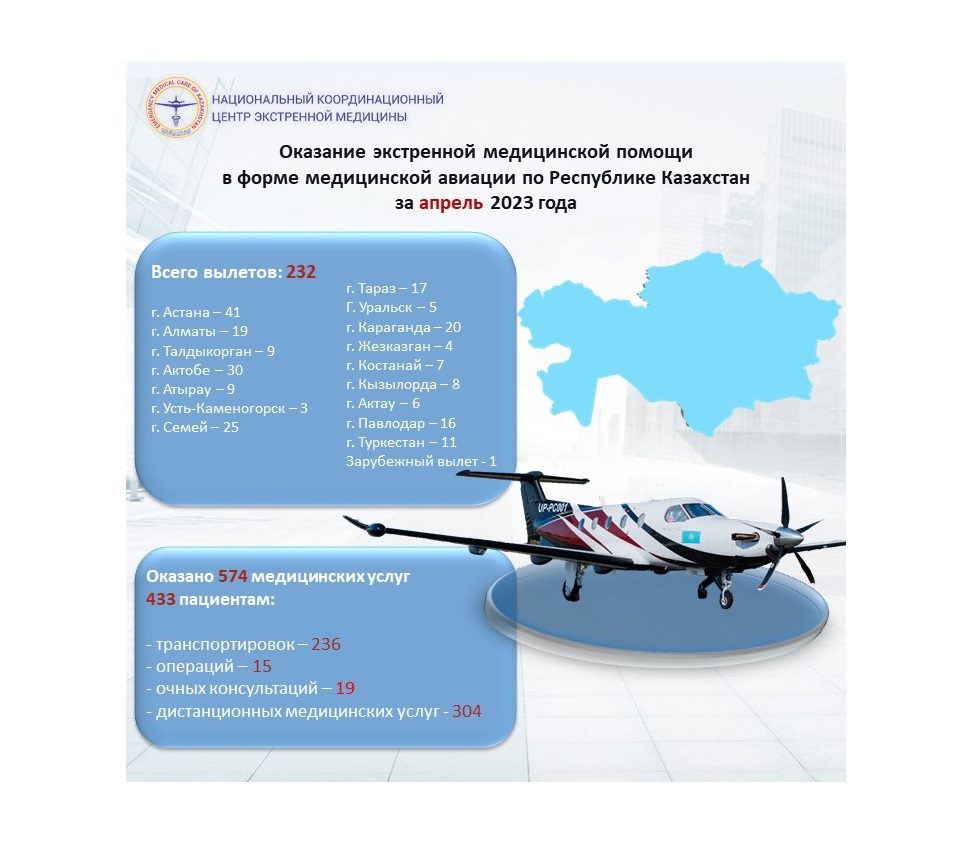 Оказание экстренной медицинской помощи в форме медицинской авиации по Республике Казахстан за апрель 2023 года