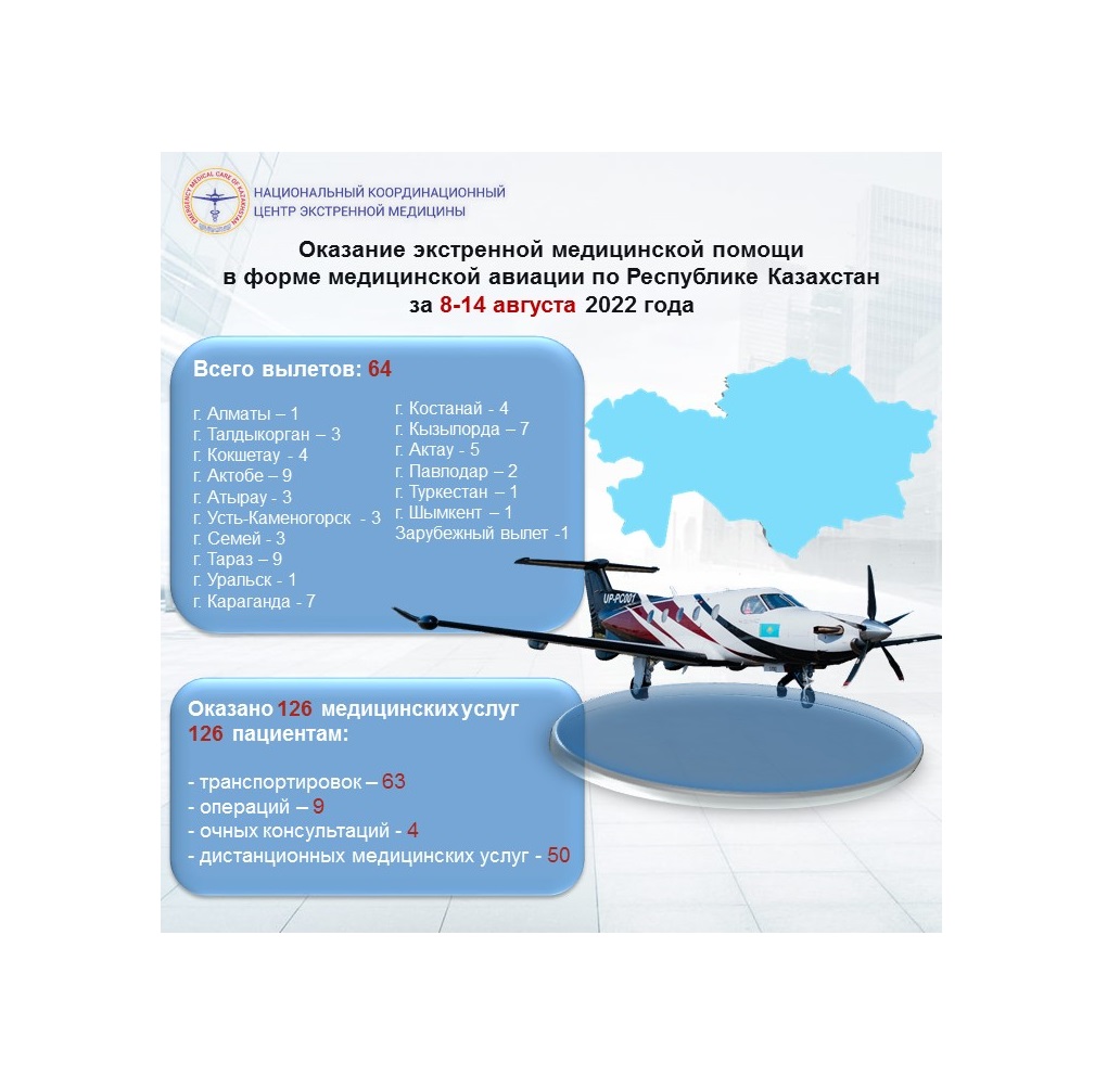 Оказание экстренной медицинской помощи в форме медицинской авиации по Республике Казахстан за 8-14 августа 2022 года