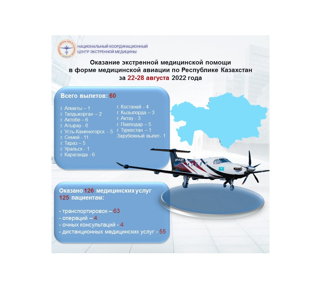 Оказание экстренной медицинской помощи в форме медицинской авиации по Республике Казахстан за 22-28 августа 2022 года