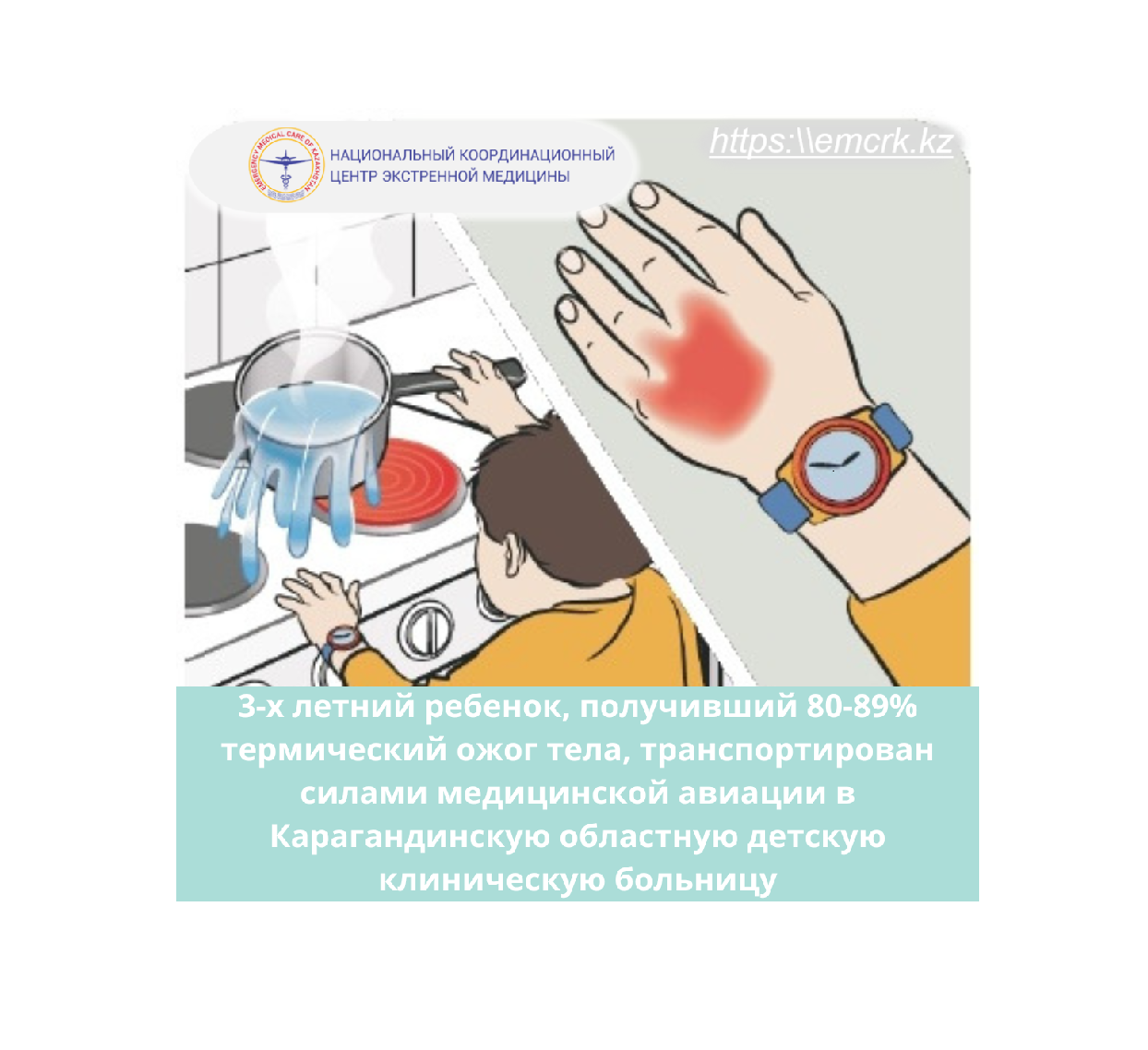 3-х летний ребенок, получивший 80-89% термический ожог тела, транспортирован силами медицинской авиации в Карагандинскую областную детскую клиническую больницу