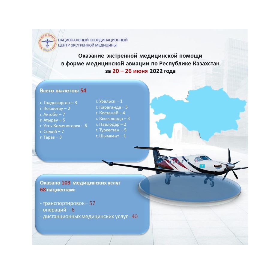 Оказание экстренной медицинской помощи в форме медицинской авиации по Республике Казахстан за 20 - 26 июня 2022 года