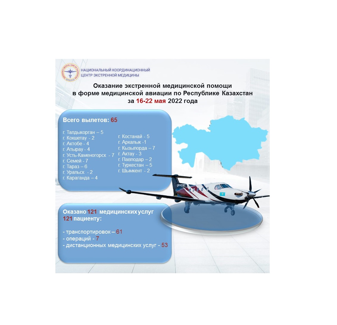 Оказание экстренной медицинской помощи в форме медицинской авиации по Республике Казахстан за 16-22 мая 2022 года