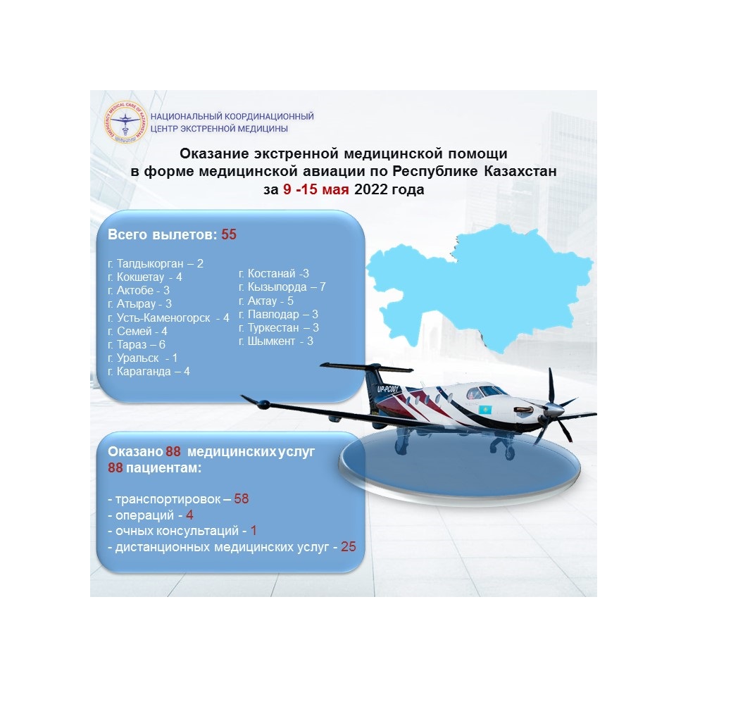 Оказание экстренной медицинской помощи в форме медицинской авиации по Республике Казахстан за 9 -15 мая 2022 года