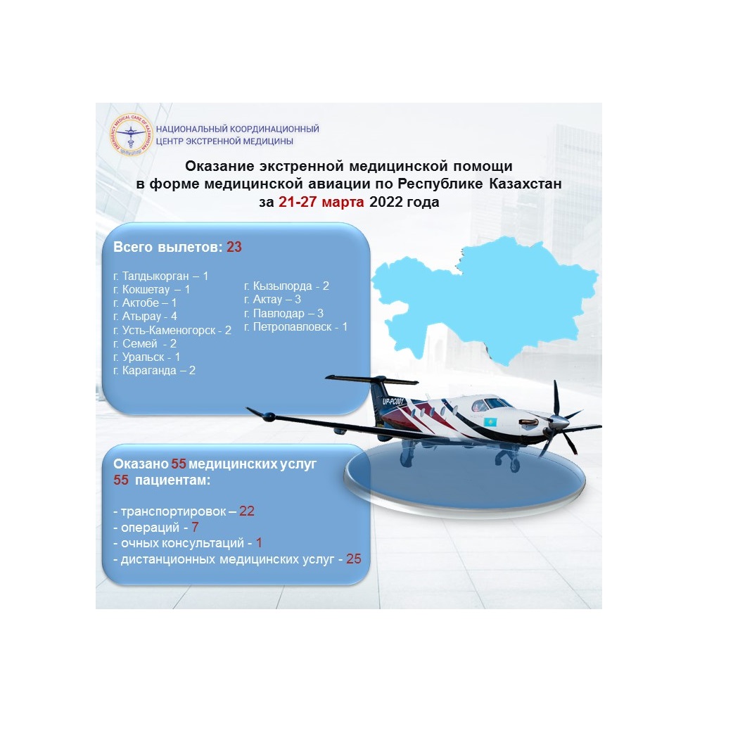 Оказание экстренной медицинской помощи в форме медицинской авиации по Республике Казахстан за 21-27 марта 2022 года
