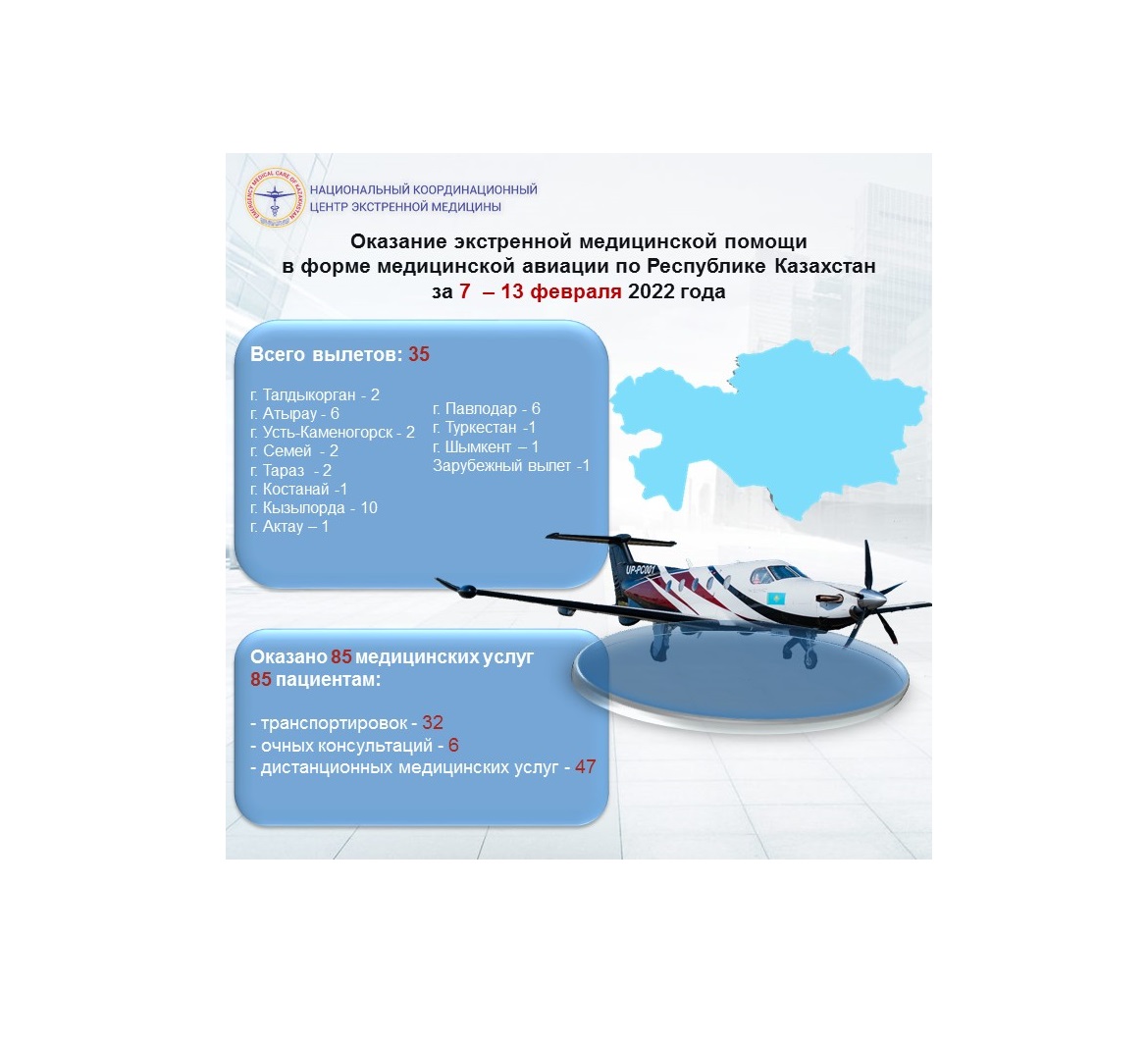 Оказание экстренной медицинской помощи в форме медицинской авиации по Республике Казахстан за 7 – 13 февраля 2022 года
