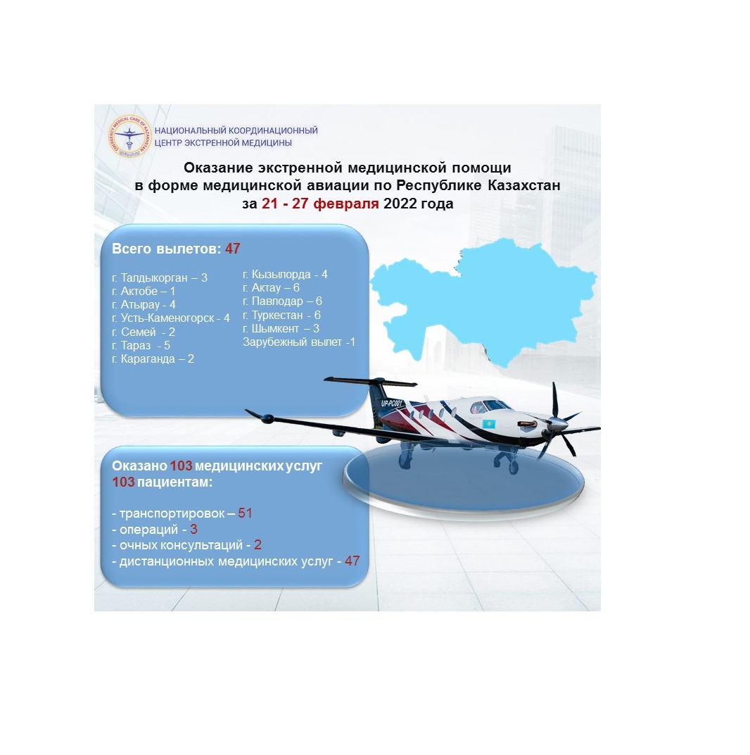 Оказание экстренной медицинской помощи в форме медицинской авиации по Республике Казахстан за 21-27 февраля 2022 года