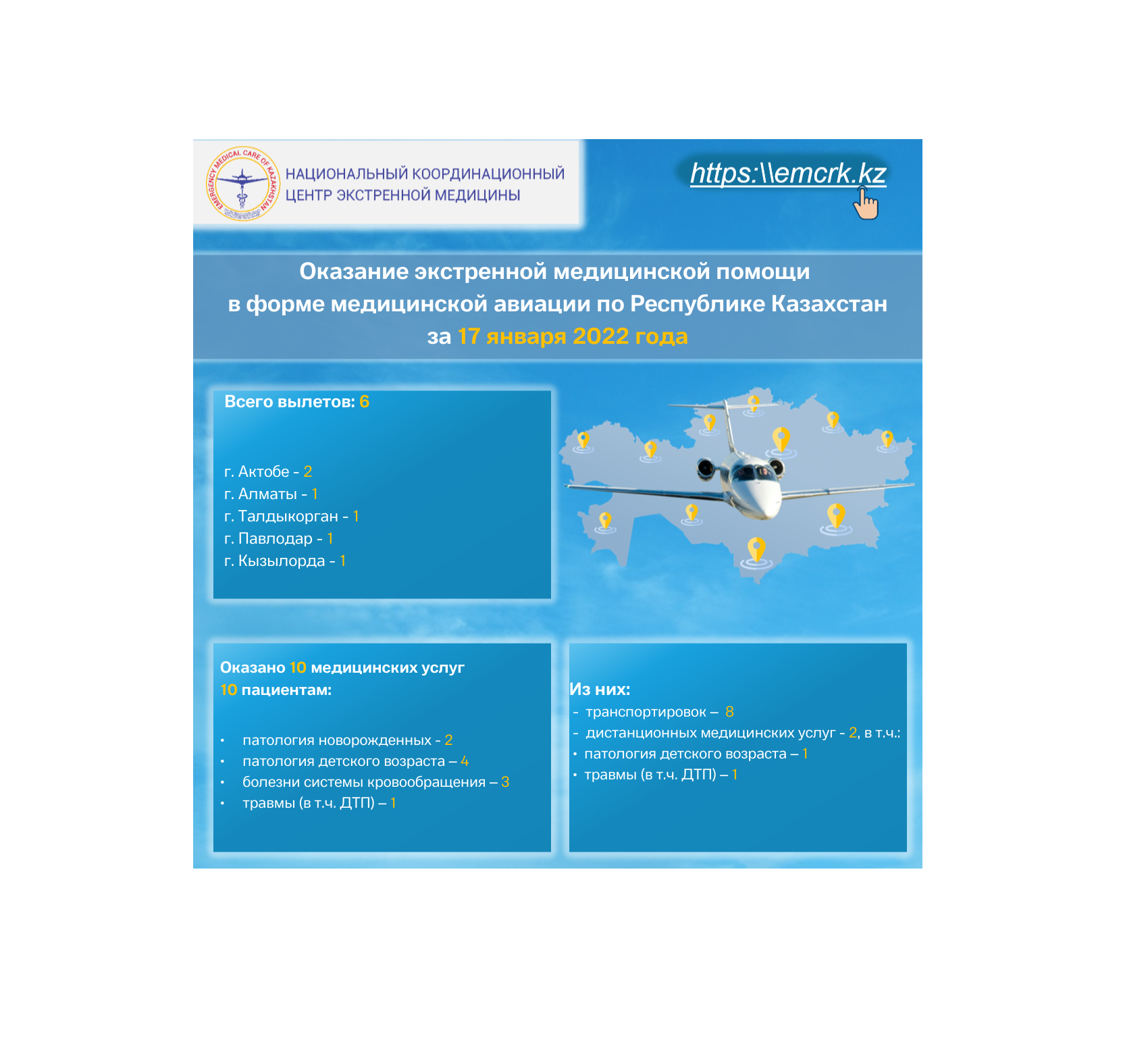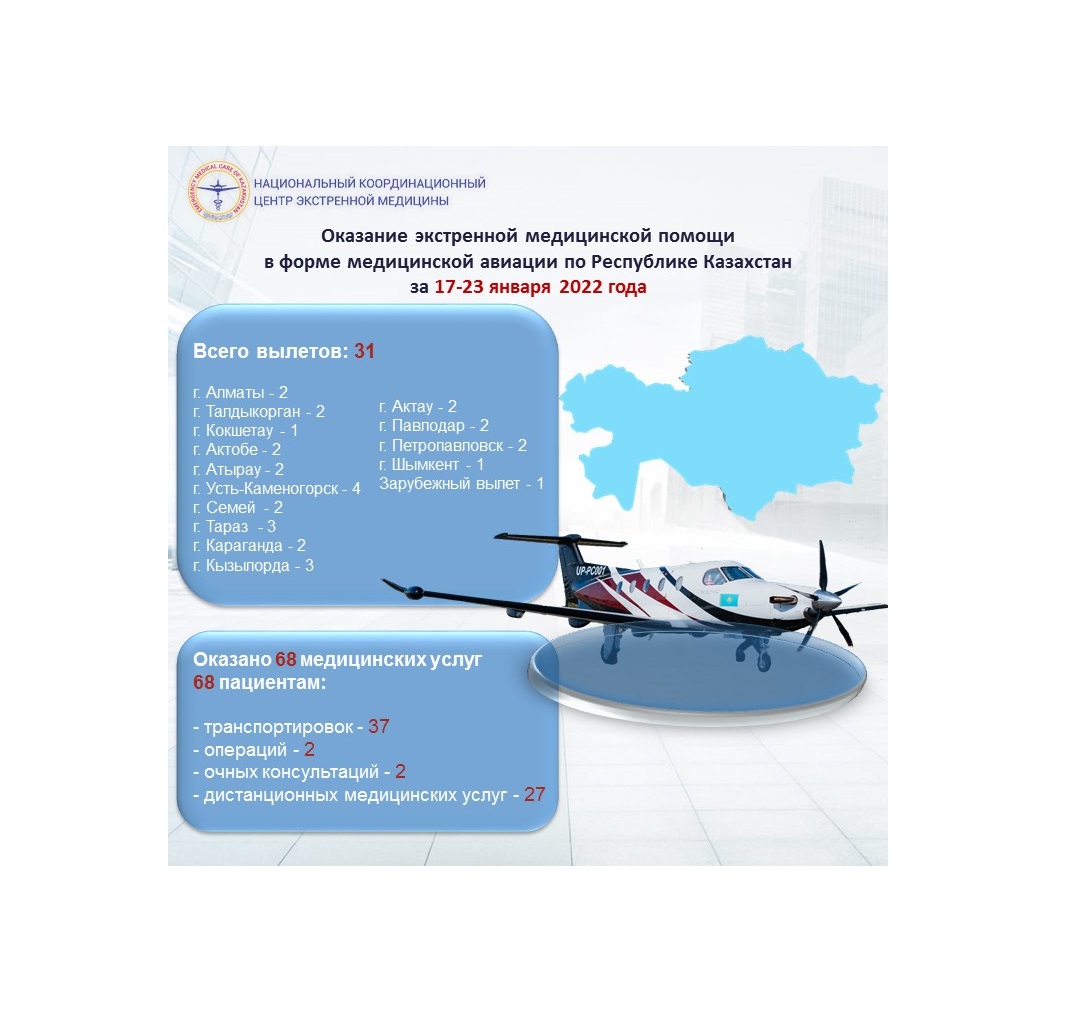 Оказание экстренной медицинской помощи в форме медицинской авиации по Республике Казахстан за 17 - 23 января 2022 года