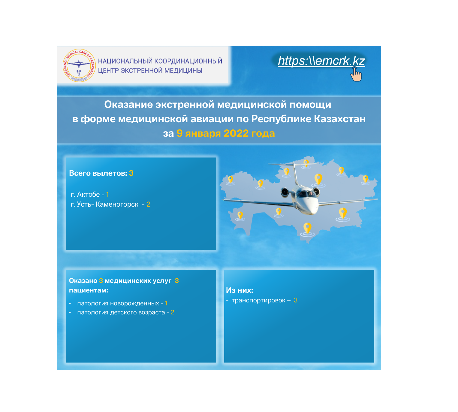 Оказание экстренной медицинской помощи в форме медицинской авиации по Республике Казахстан за 9 января 2022 года