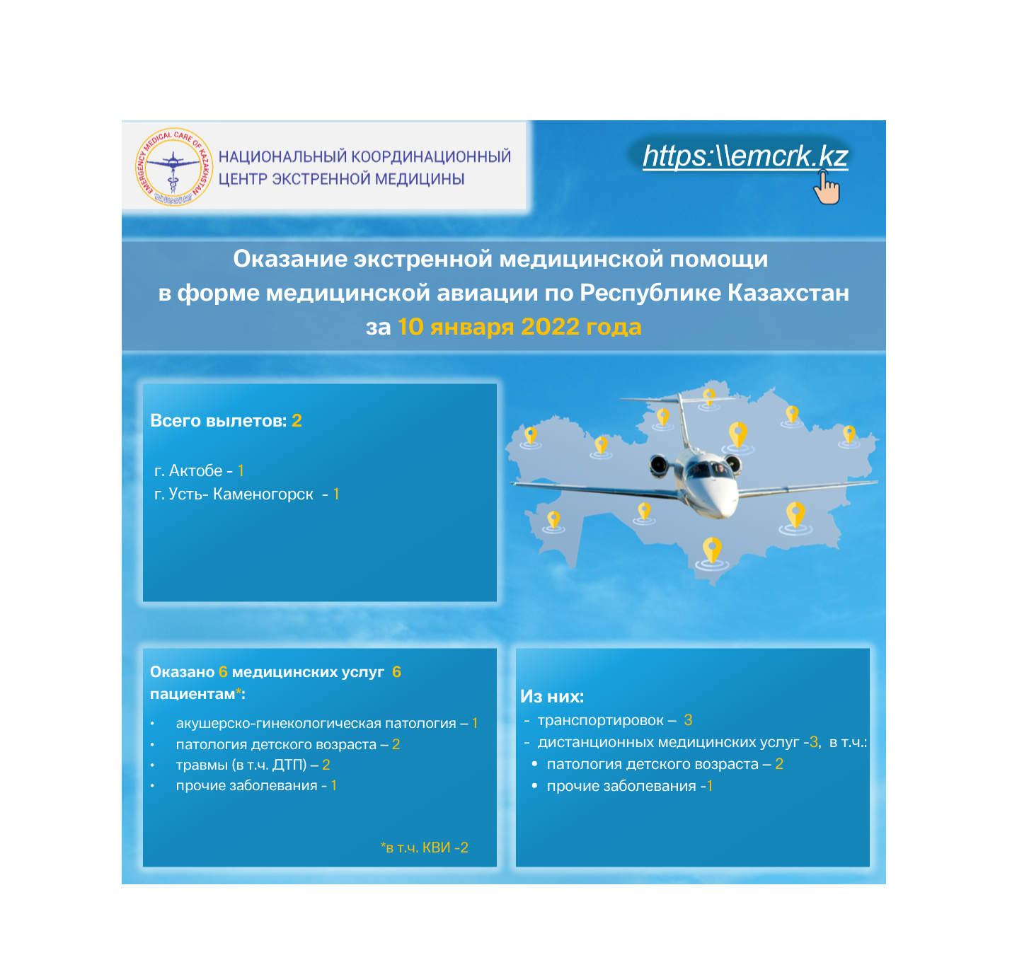 Оказание экстренной медицинской помощи в форме медицинской авиации по Республике Казахстан за 10 января 2022 года