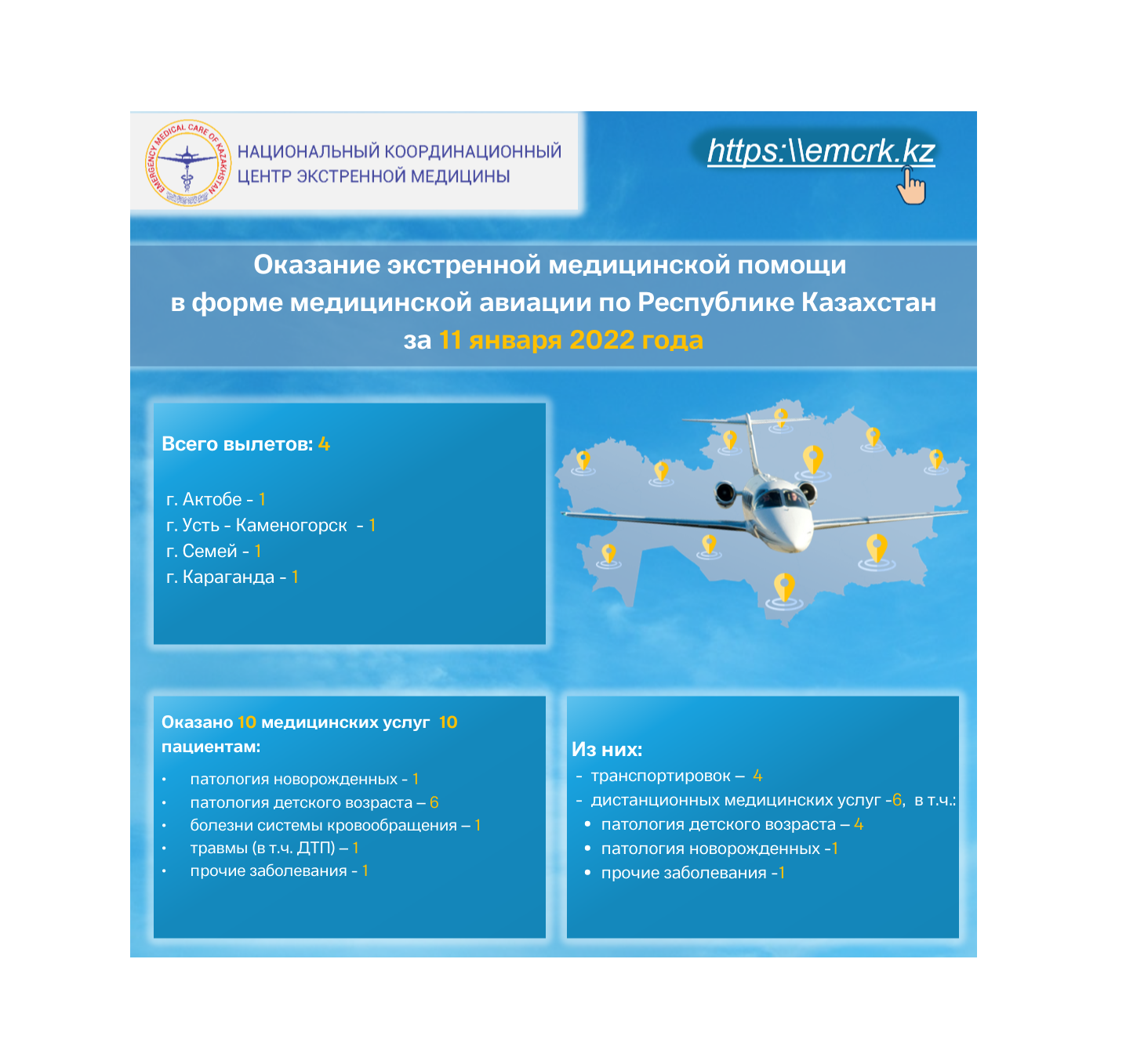 Оказание экстренной медицинской помощи в форме медицинской авиации по Республике Казахстан за 11 января 2022 года