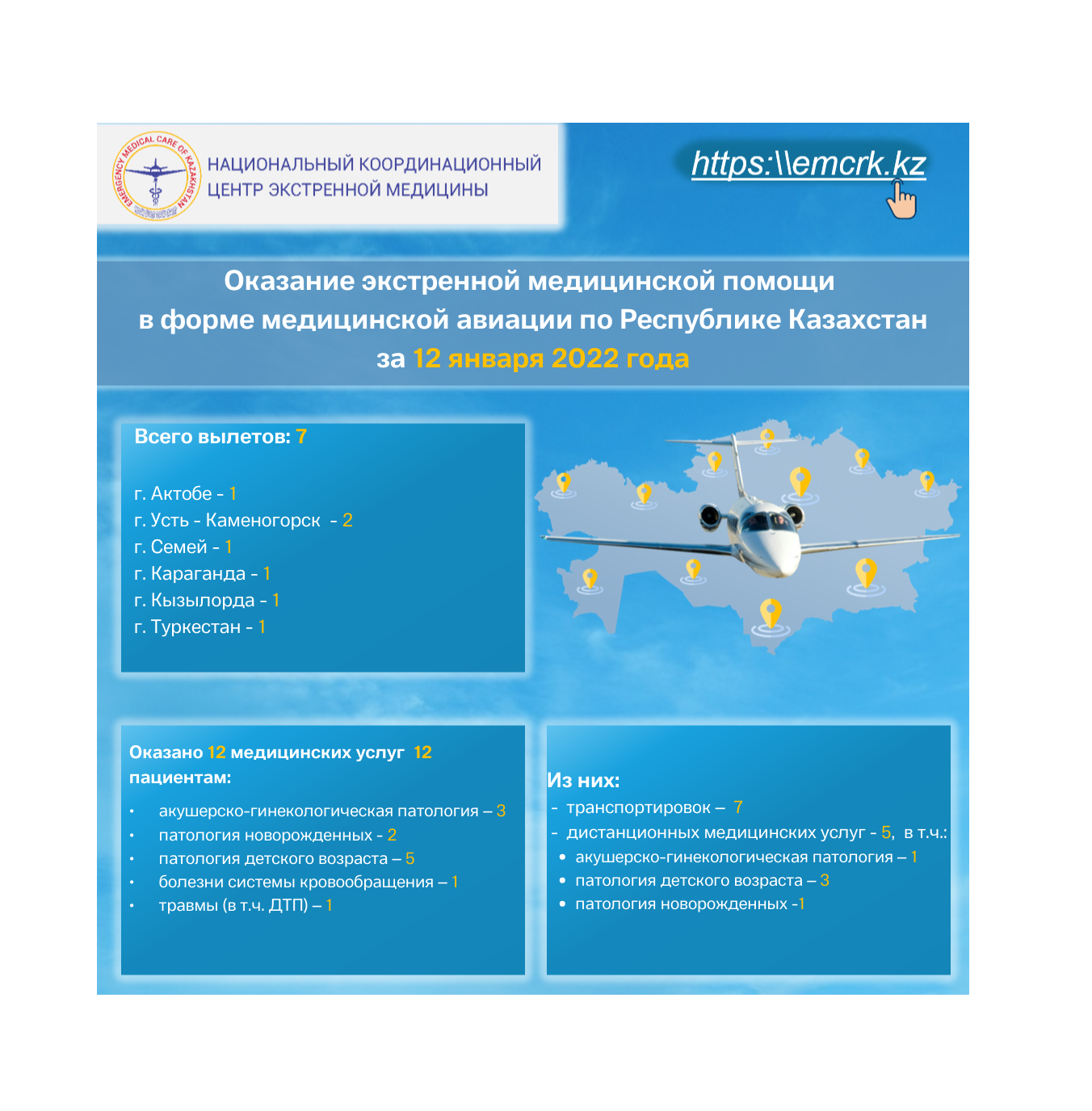 Оказание экстренной медицинской помощи в форме медицинской авиации по Республике Казахстан за 12 января 2022 года