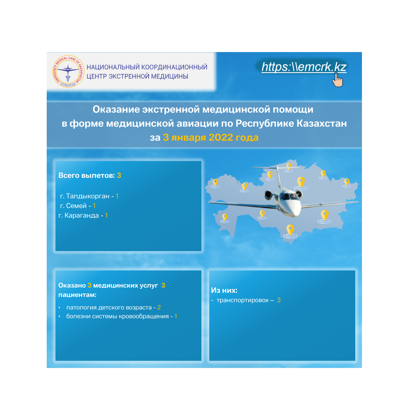 Оказание экстренной медицинской помощи в форме медицинской авиации по Республике Казахстан за 3 января 2022 года