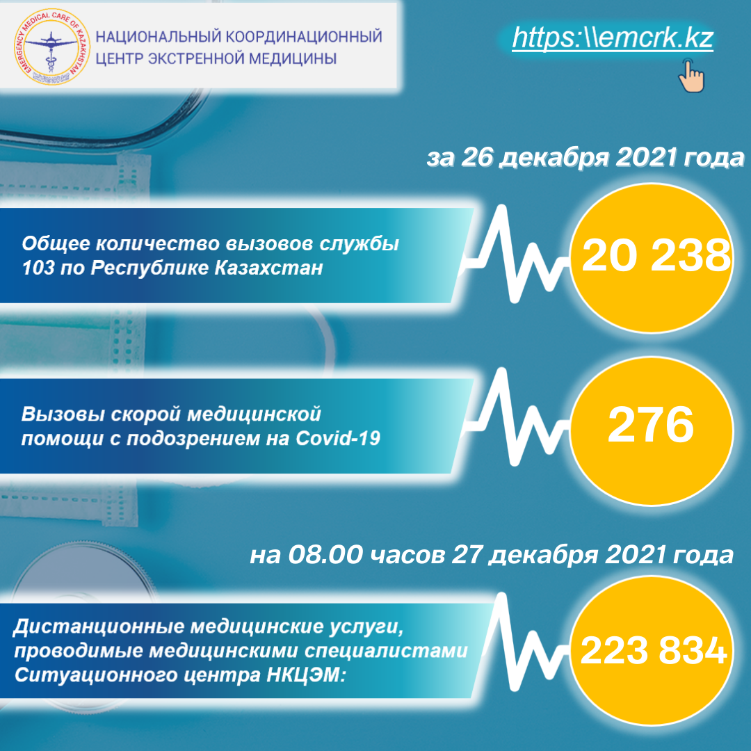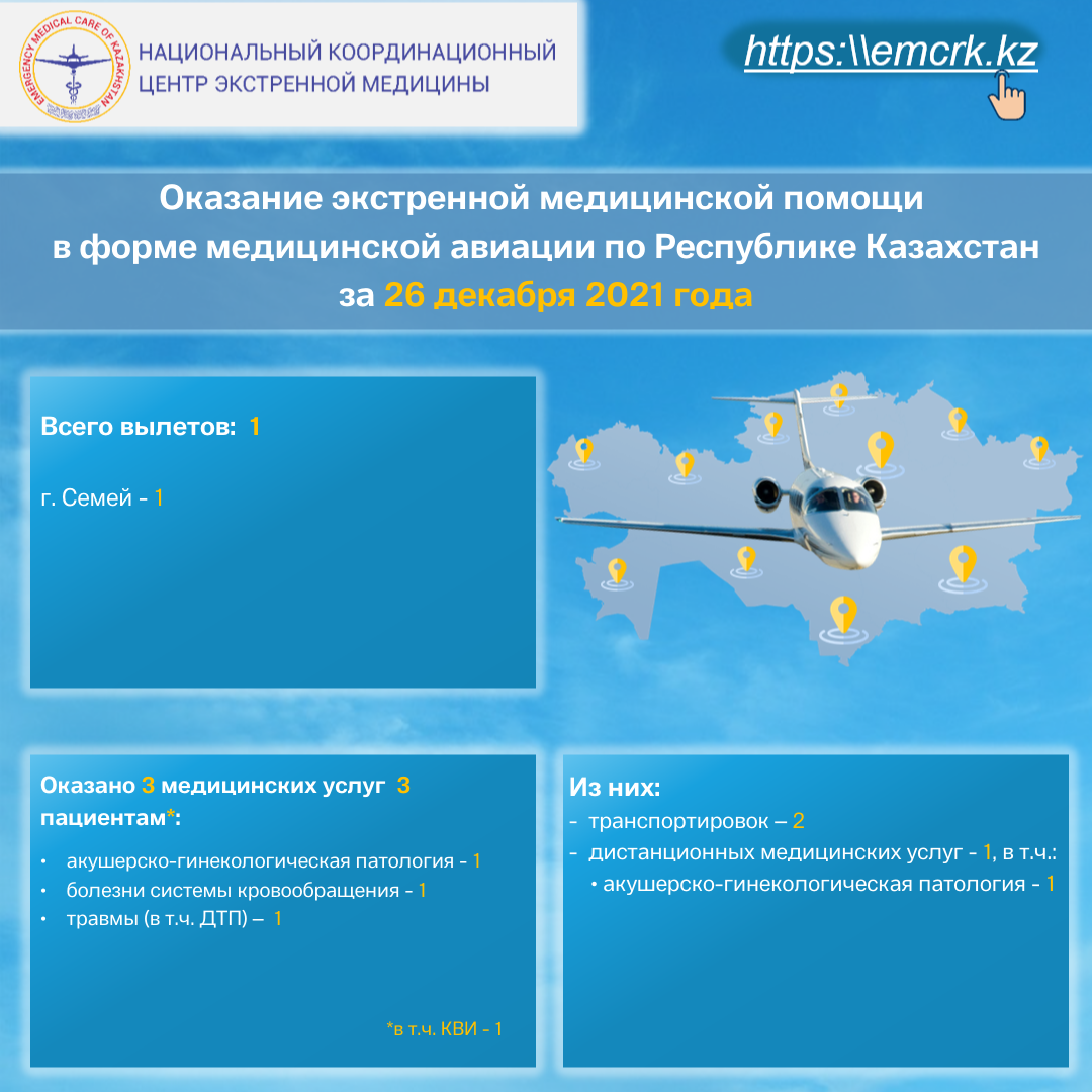 Оказание экстренной медицинской помощи в форме медицинской авиации по Республике Казахстан за 26 декабря 2021 года.