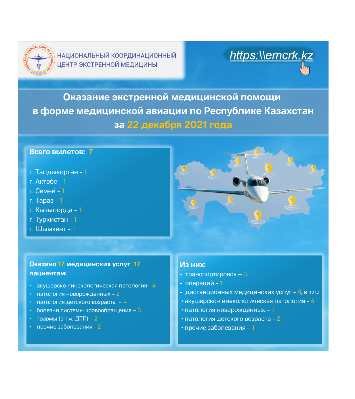 Оказание экстренной медицинской помощи в форме медицинской авиации по Республике Казахстан за 22 декабря 2021 года.