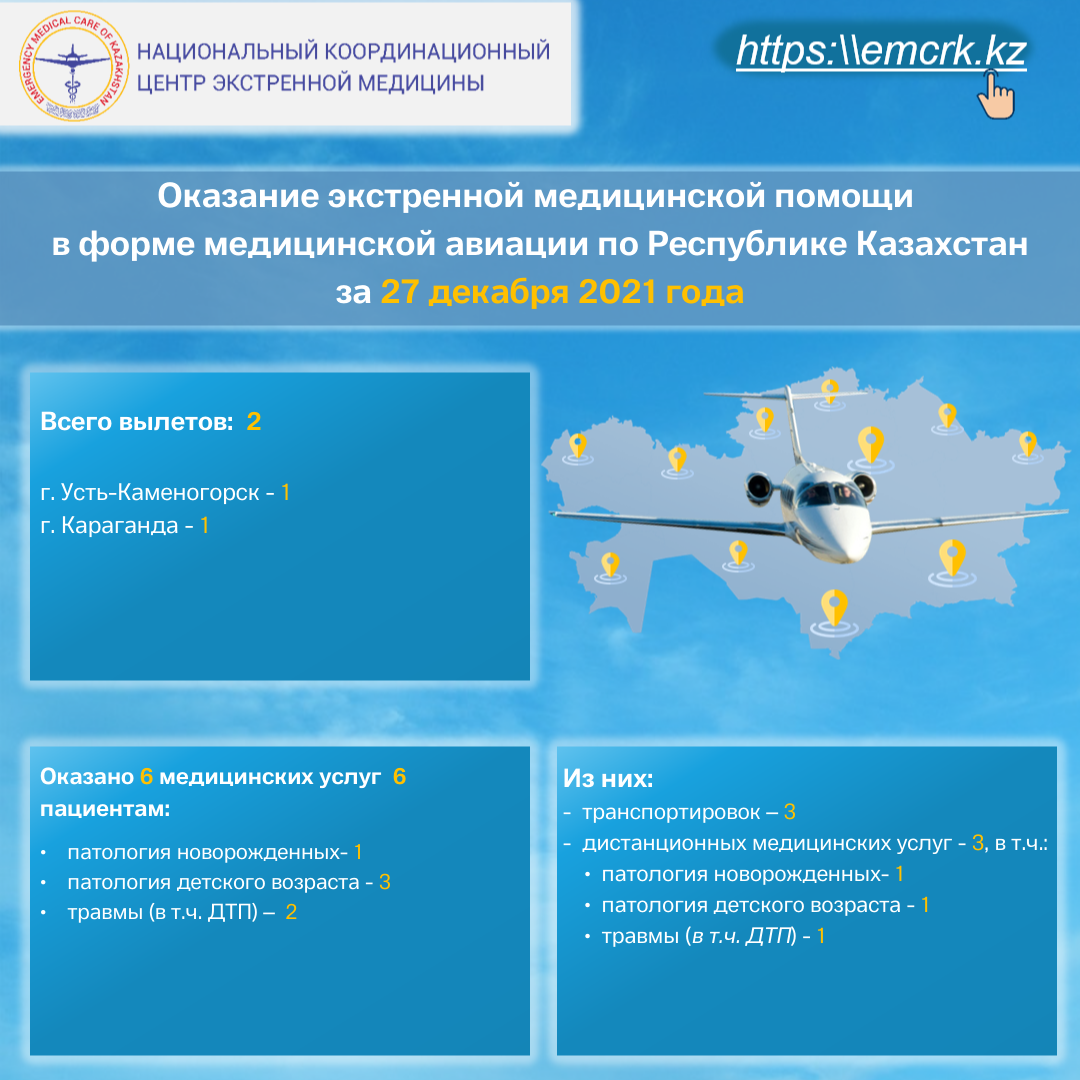 Оказание экстренной медицинской помощи в форме медицинской авиации по Республике Казахстан за 27 декабря 2021 года