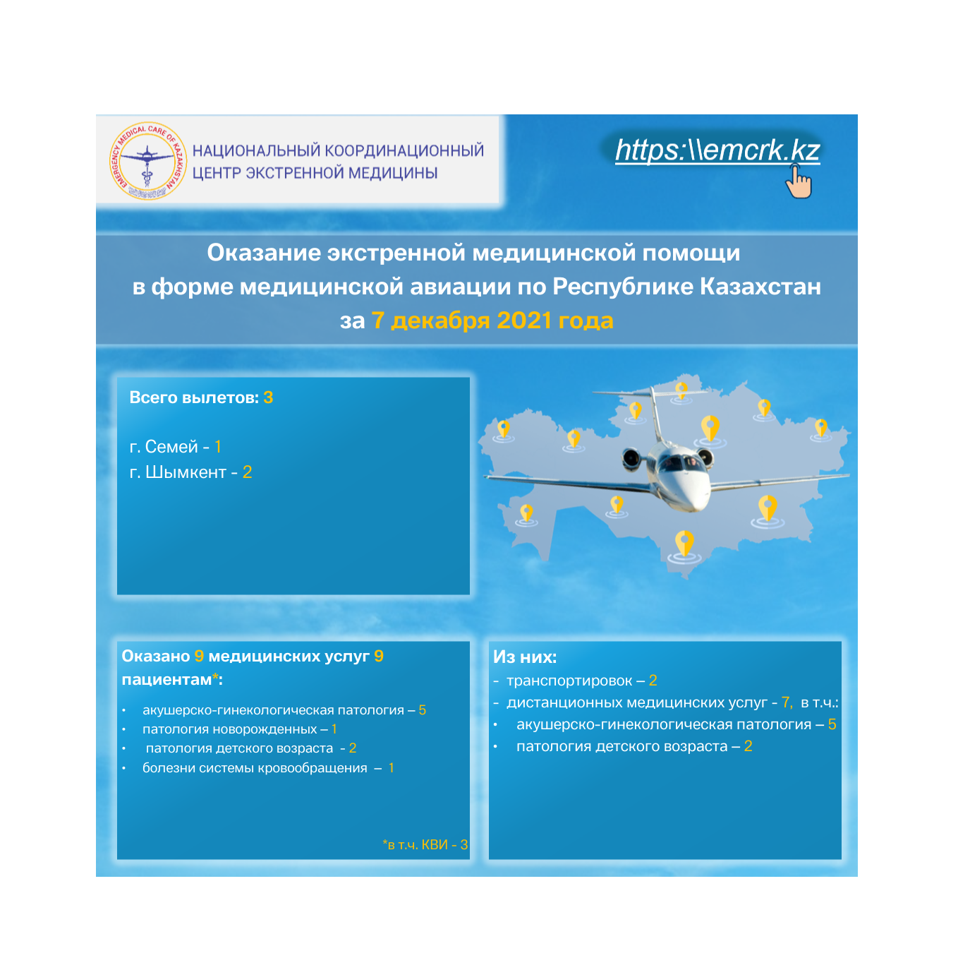 Оказание экстренной медицинской помощи в форме медицинской авиации по Республике Казахстан за 7 декабря 2021 года