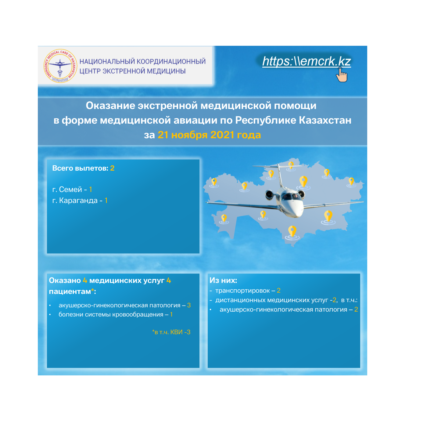 Оказание экстренной медицинской помощи в форме медицинской авиации по Республике Казахстан за 21 ноября 2021 года