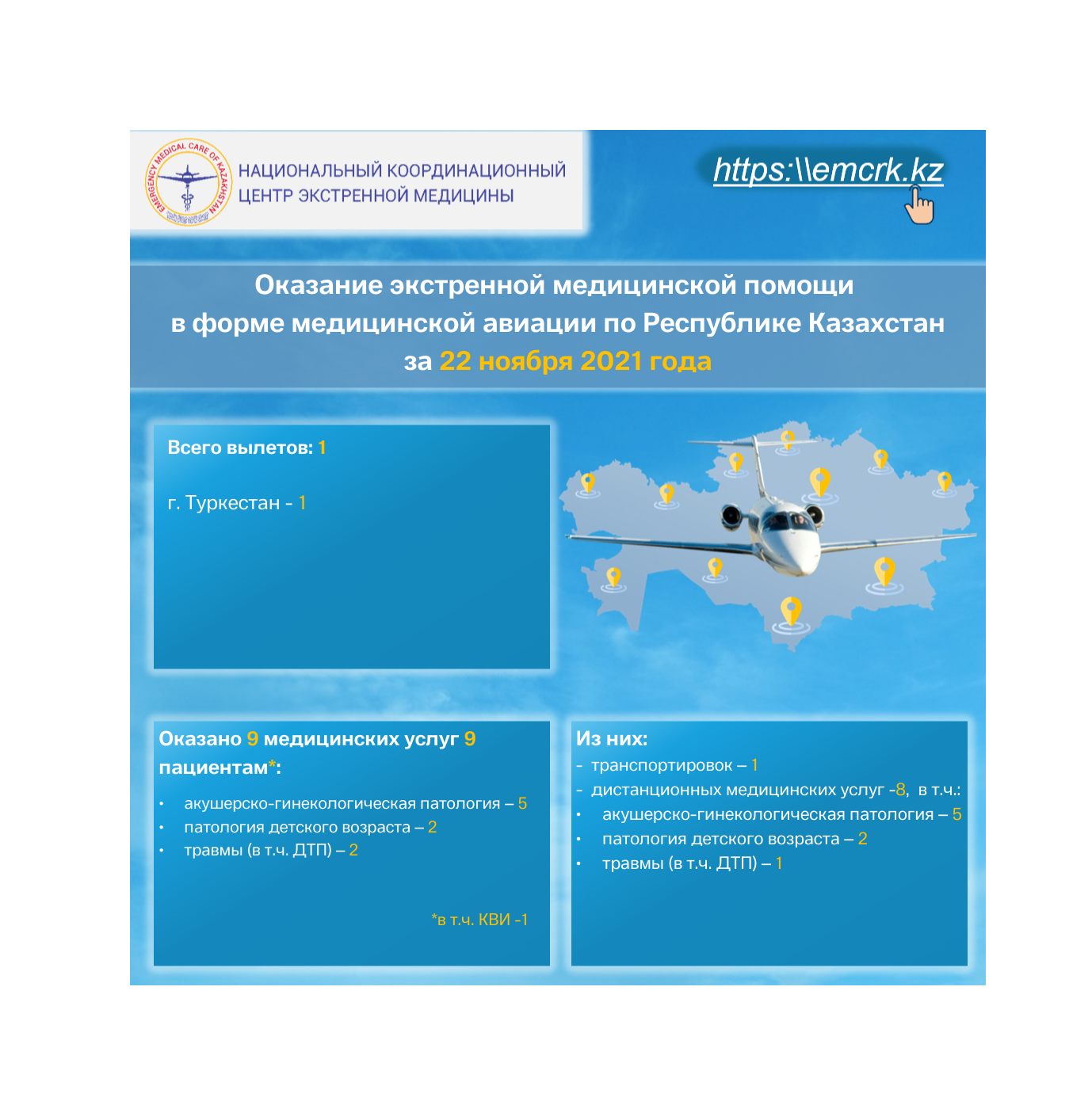 Оказание экстренной медицинской помощи в форме медицинской авиации по Республике Казахстан за 22 ноября 2021 года