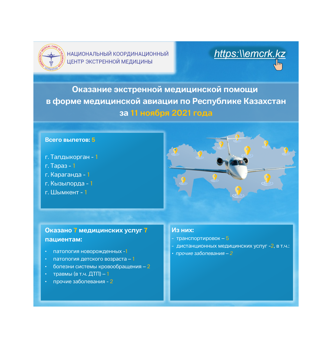 Оказание экстренной медицинской помощи в форме медицинской авиации по Республике Казахстан за 11 ноября 2021 года