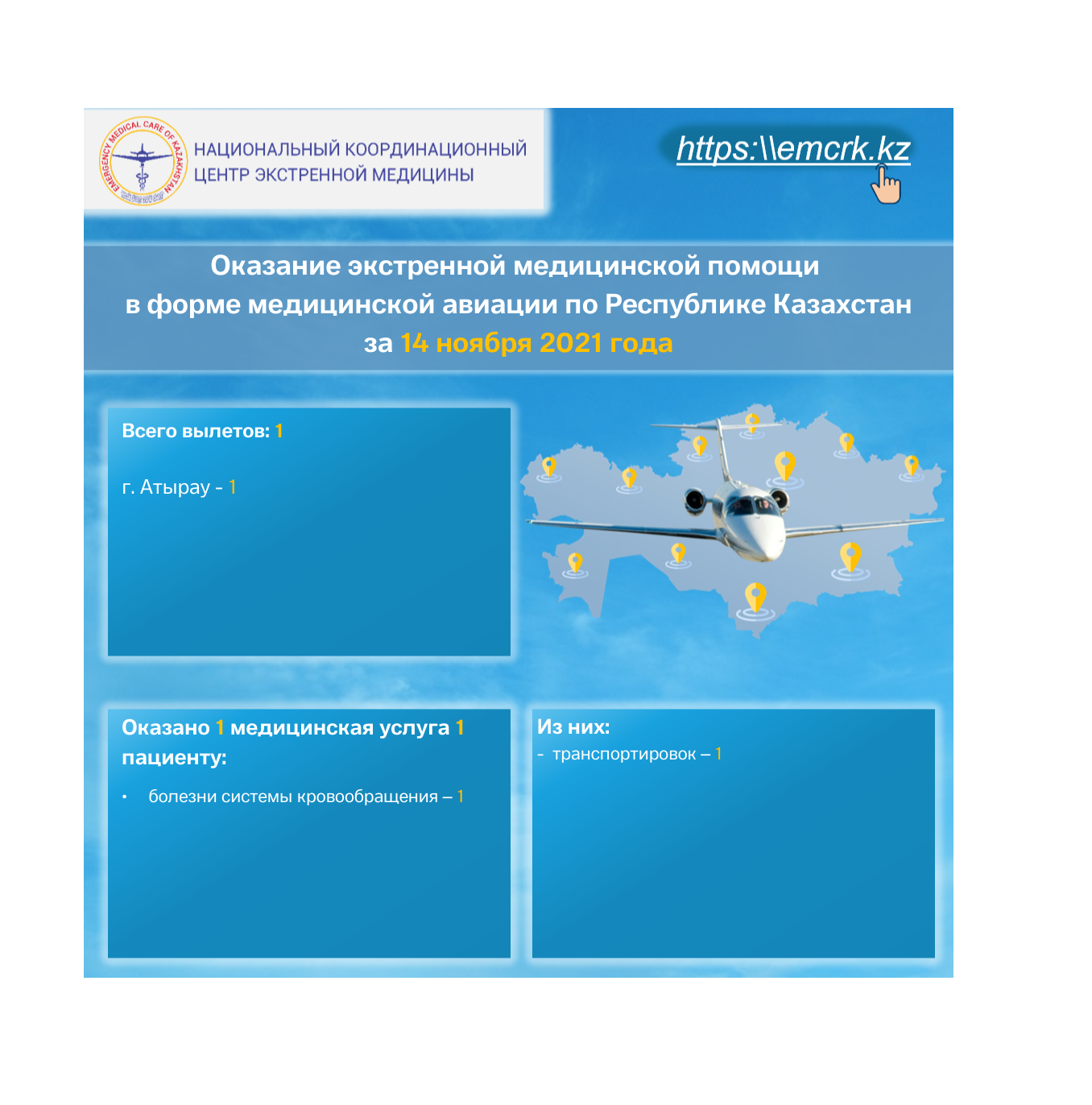 Оказание экстренной медицинской помощи в форме медицинской авиации по Республике Казахстан за 14 ноября 2021 года