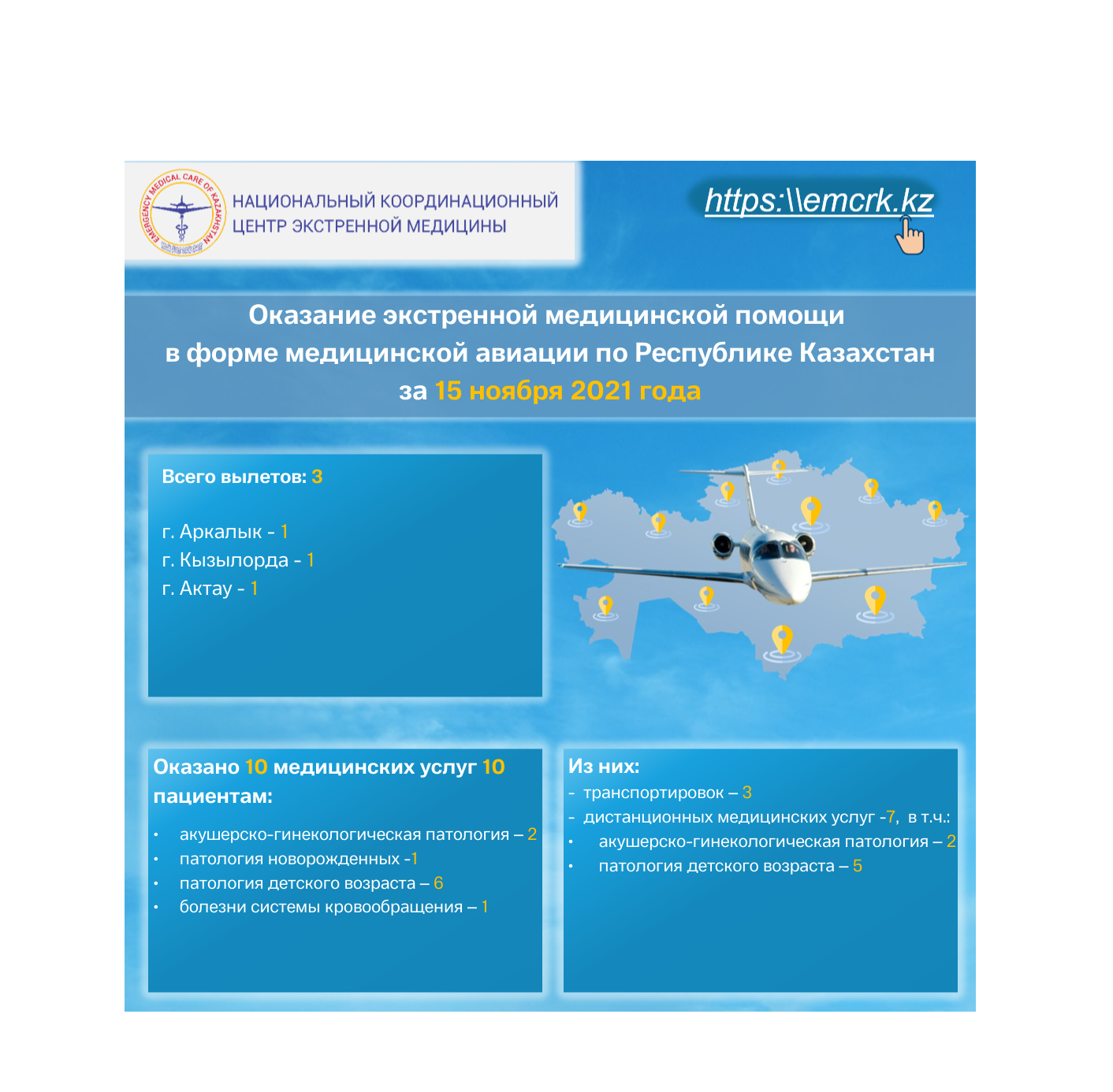 Оказание экстренной медицинской помощи в форме медицинской авиации по Республике Казахстан за 15 ноября 2021 года