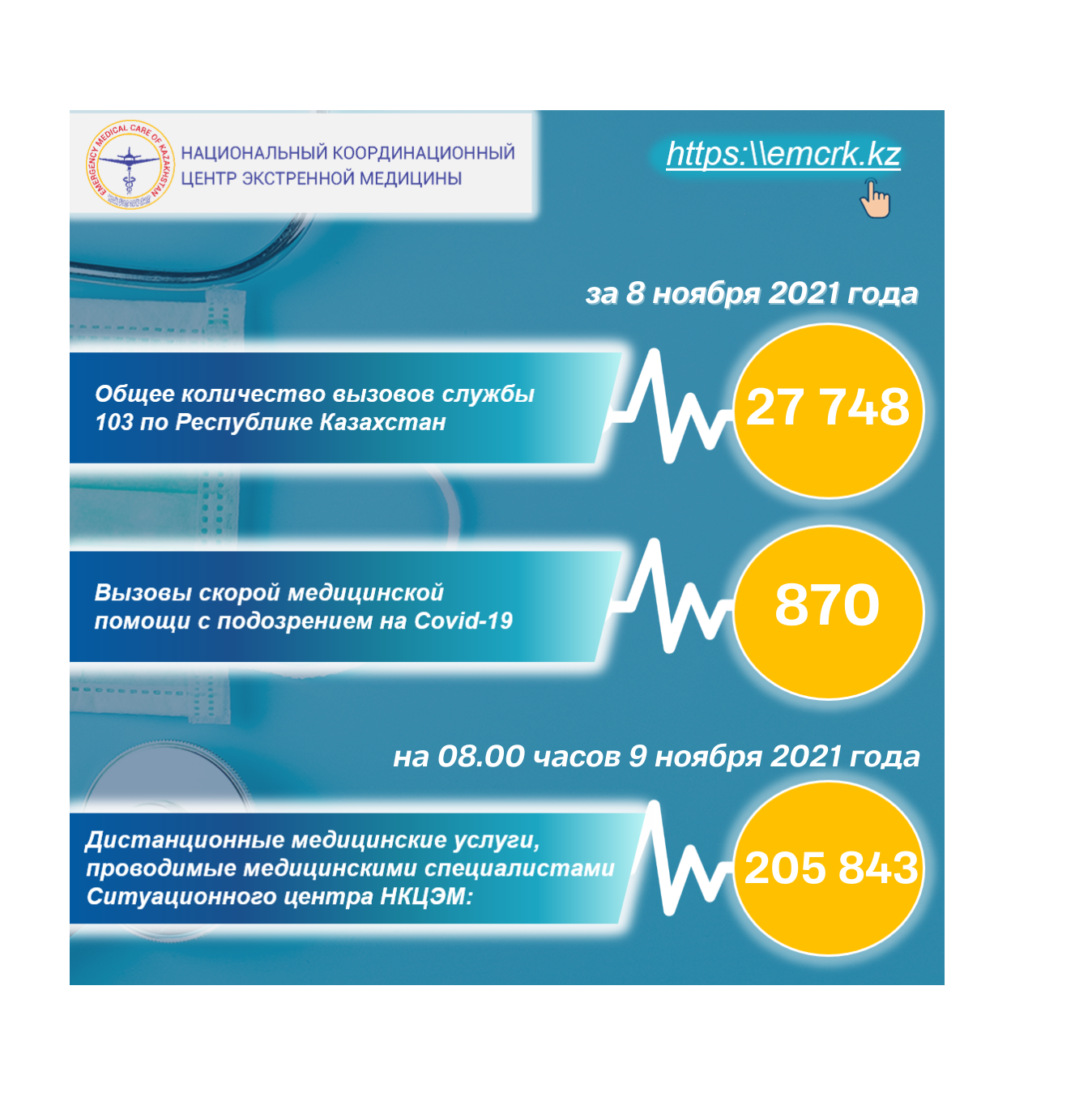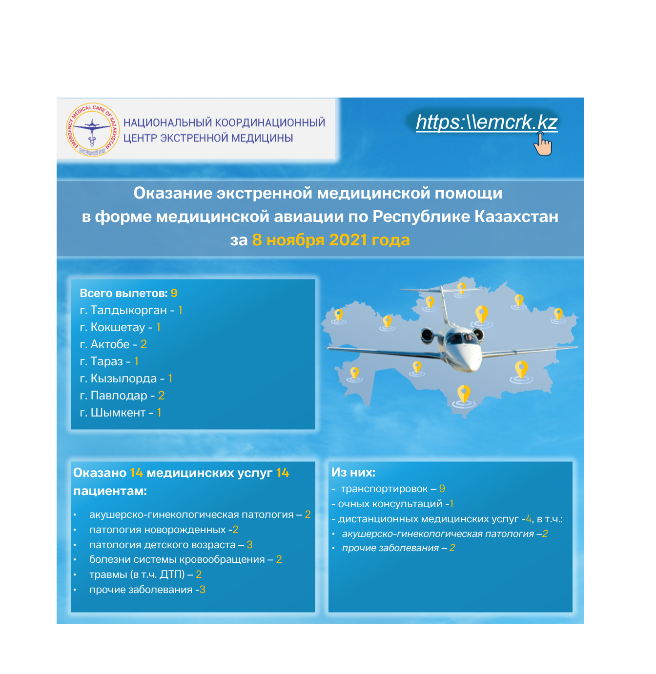 Оказание экстренной медицинской помощи в форме медицинской авиации по Республике Казахстан за 8 ноября 2021 года