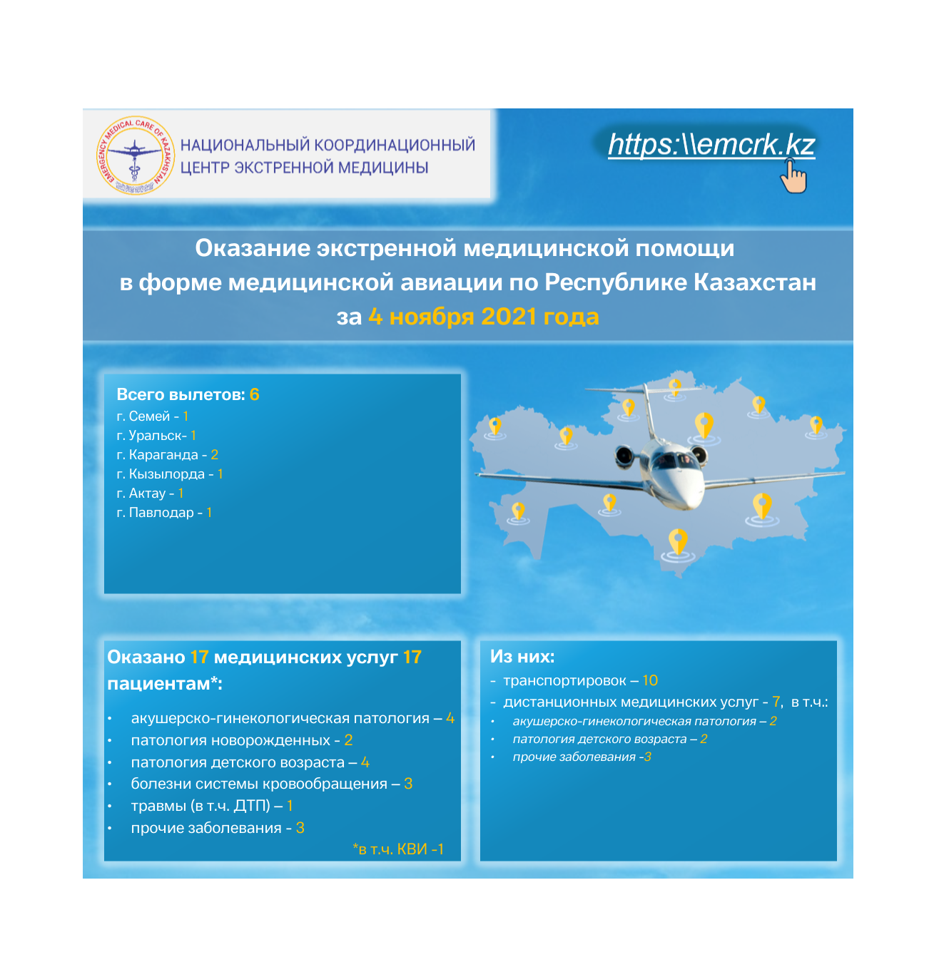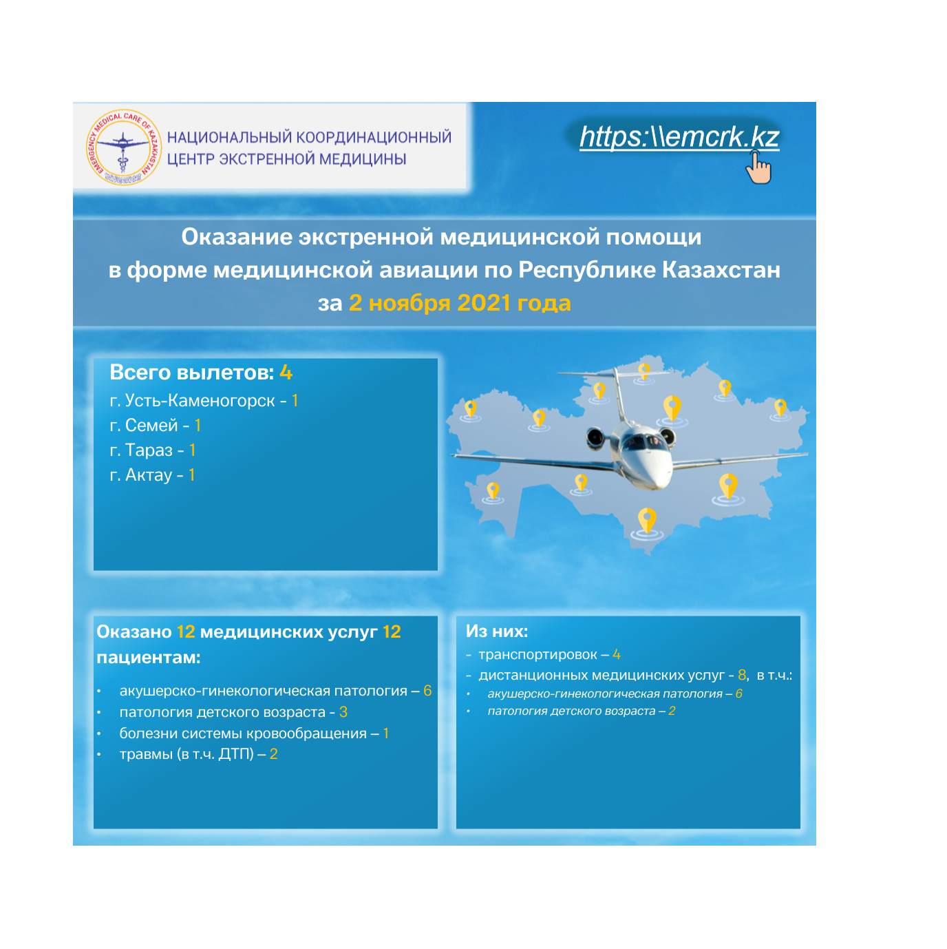 Оказание экстренной медицинской помощи в форме медицинской авиации по Республике Казахстан за 4 ноября 2021 года
