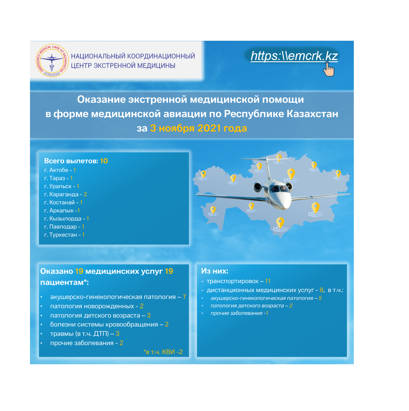 Оказание экстренной медицинской помощи в форме медицинской авиации по Республике Казахстан за 3 ноября 2021 года