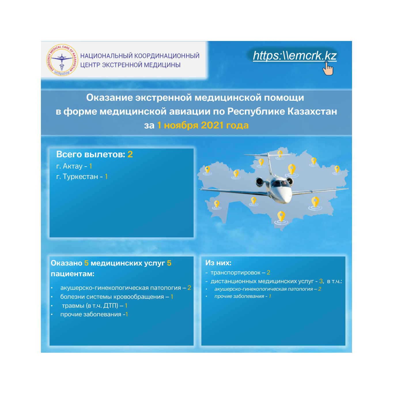 Оказание экстренной медицинской помощи в форме медицинской авиации по Республике Казахстан за 1 ноября 2021 года