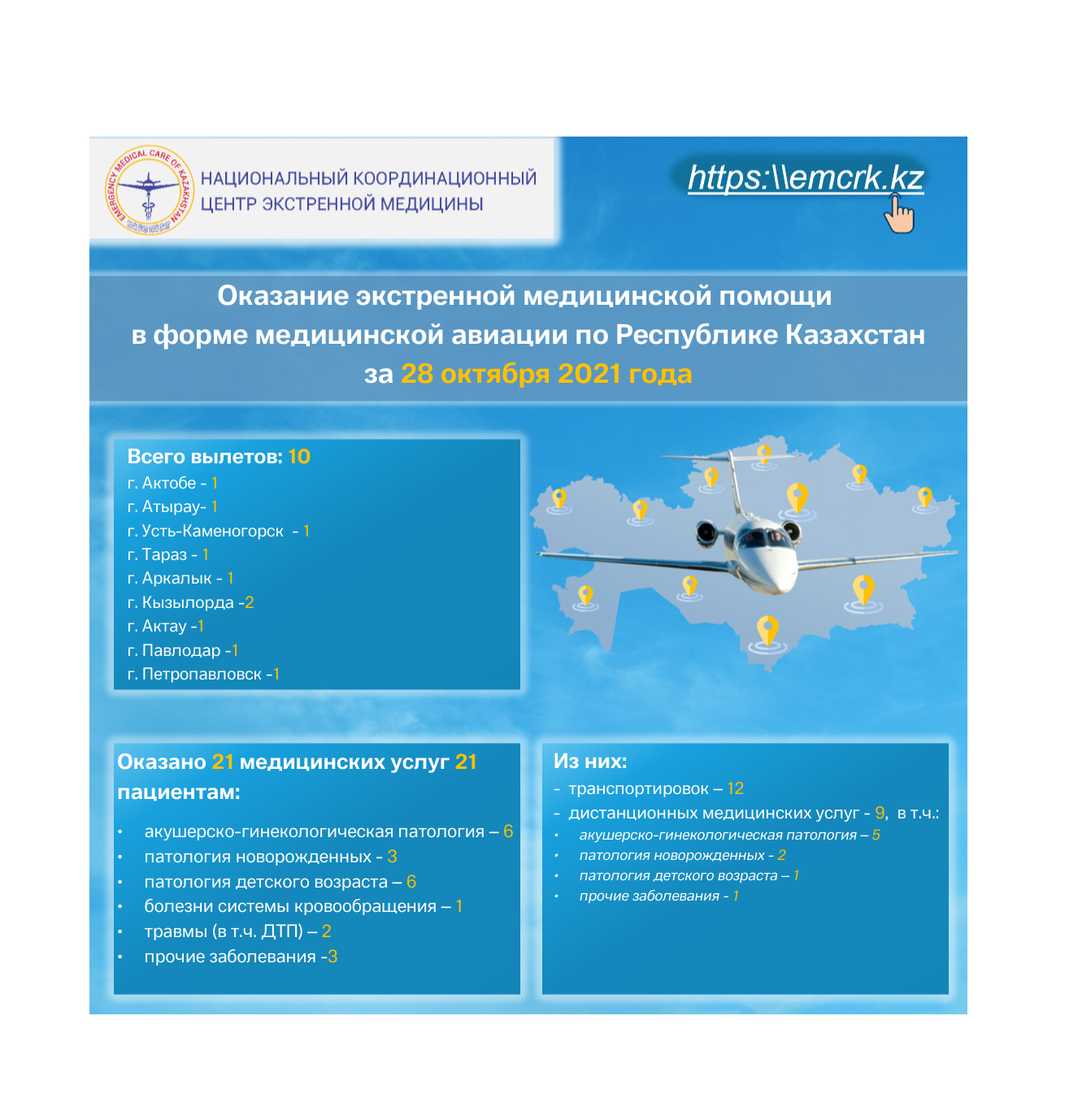 Оказание экстренной медицинской помощи в форме медицинской авиации по Республике Казахстан за 28 октября 2021 года