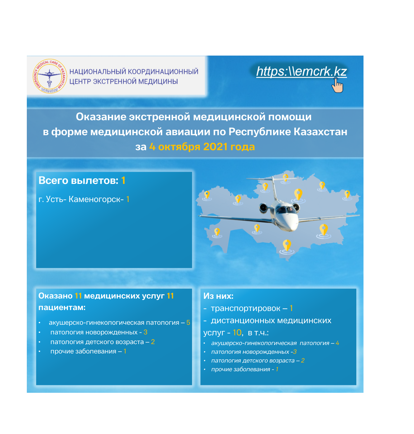 Оказание экстренной медицинской помощи в форме медицинской авиации по Республике Казахстан за 4 октября 2021 года