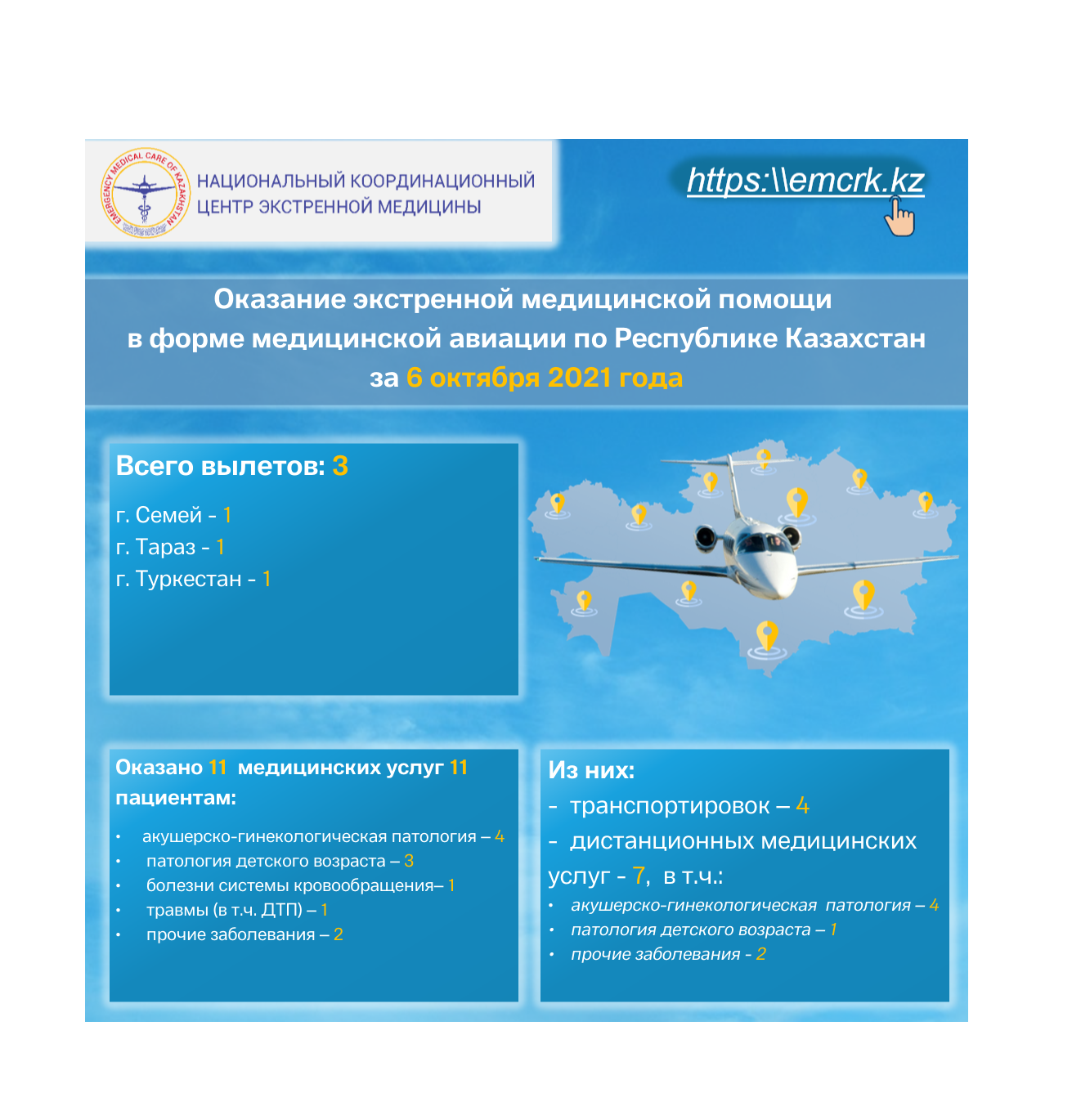 Оказание экстренной медицинской помощи в форме медицинской авиации по Республике Казахстан за 6 октября 2021 года