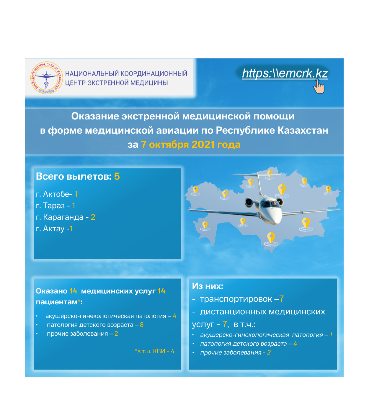 Оказание экстренной медицинской помощи в форме медицинской авиации по Республике Казахстан за 7 октября 2021 года