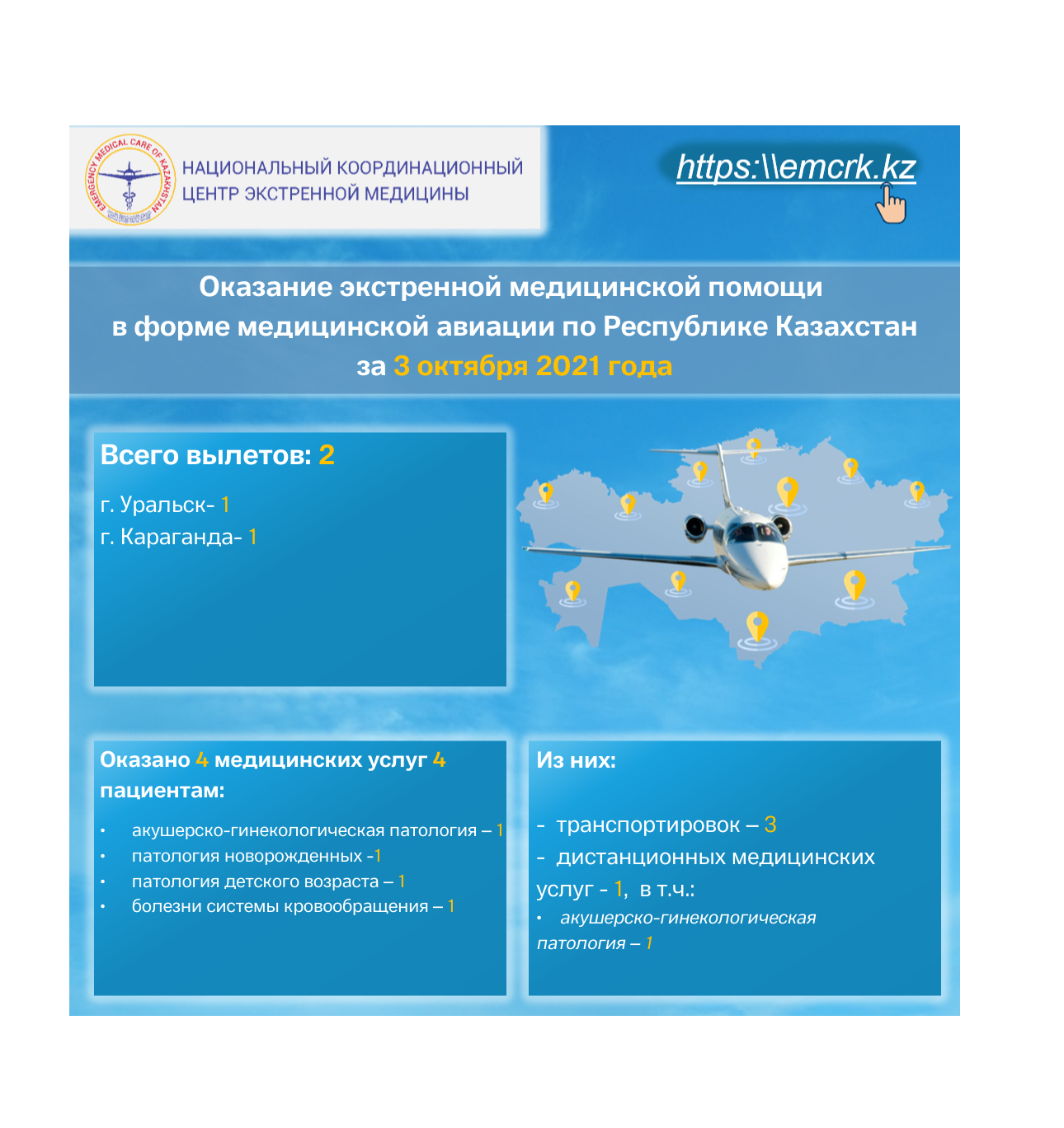 Оказание экстренной медицинской помощи в форме медицинской авиации по Республике Казахстан за 3 октября 2021 года