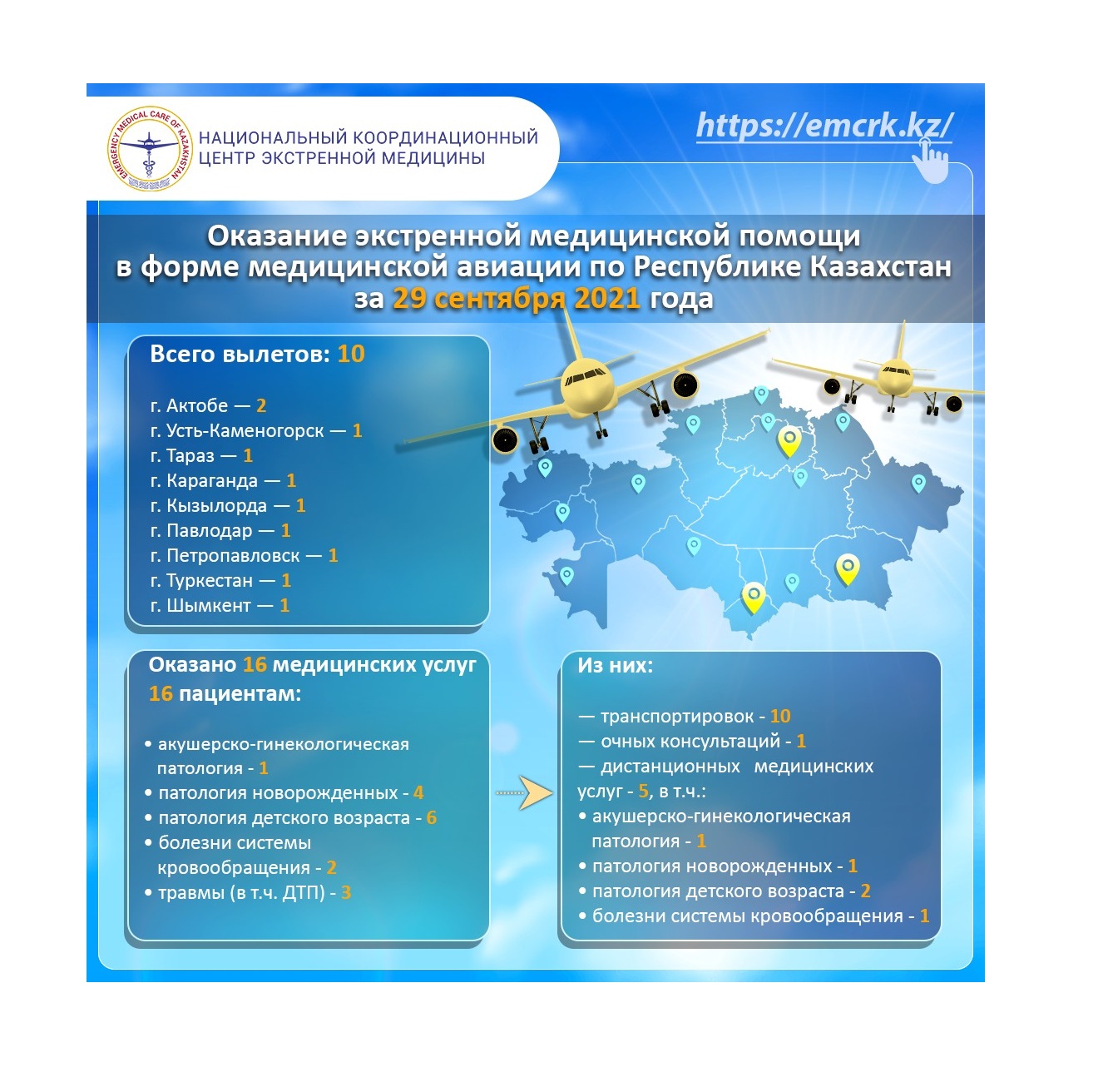 Оказание экстренной медицинской помощи в форме медицинской авиации по Республике Казахстан за 29 сентября 2021 года