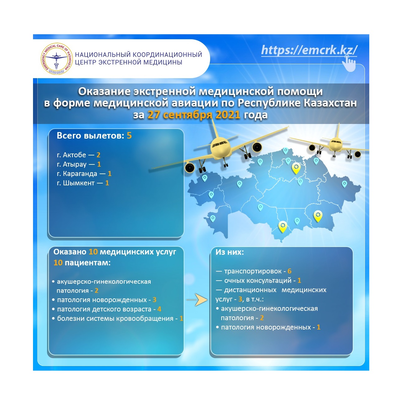 Оказание экстренной медицинской помощи в форме медицинской авиации по Республике Казахстан за 27 сентября 2021 года