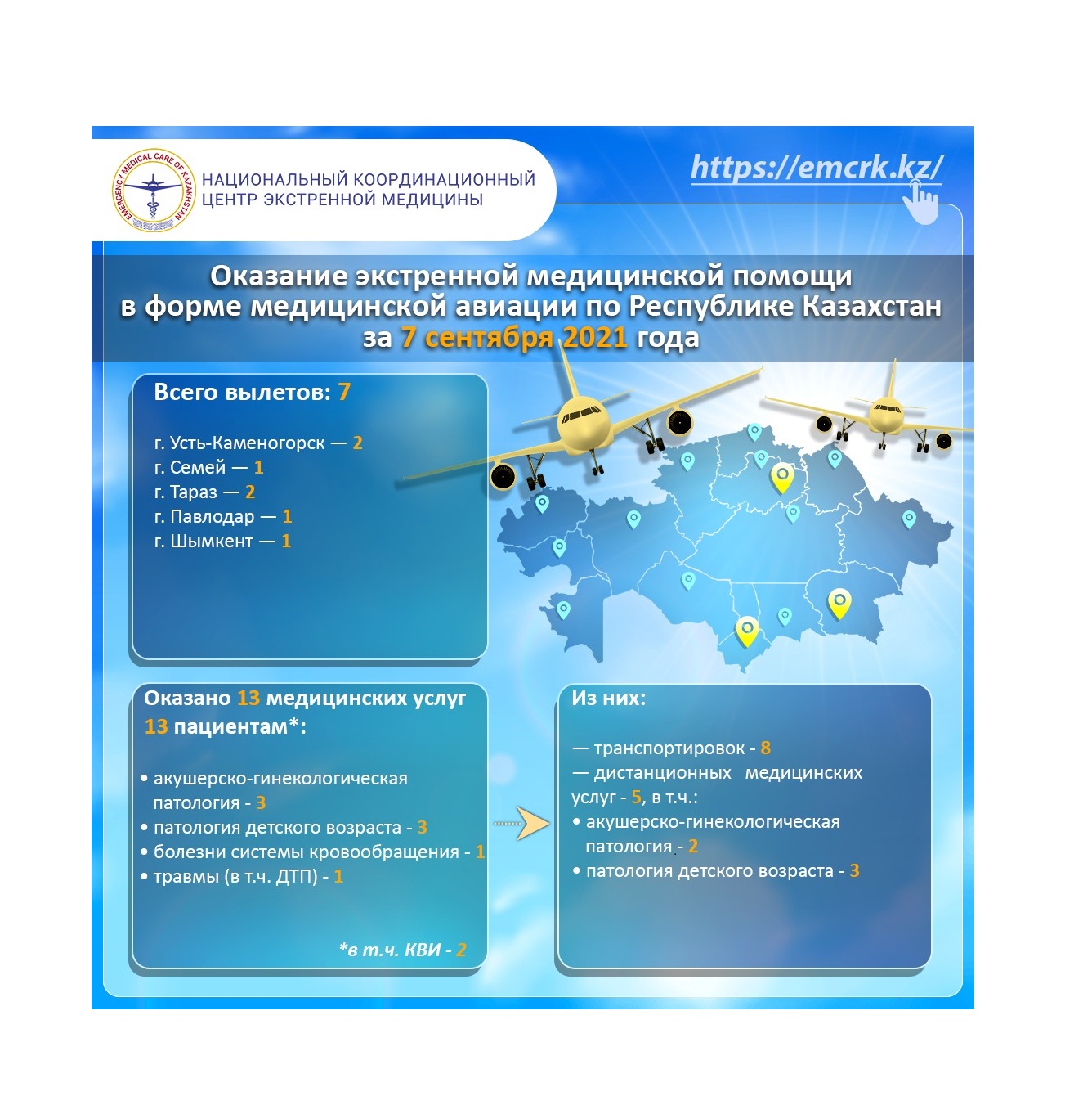 Оказание экстренной медицинской помощи в форме медицинской авиации по Республике Казахстан за 7 сентября 2021 года