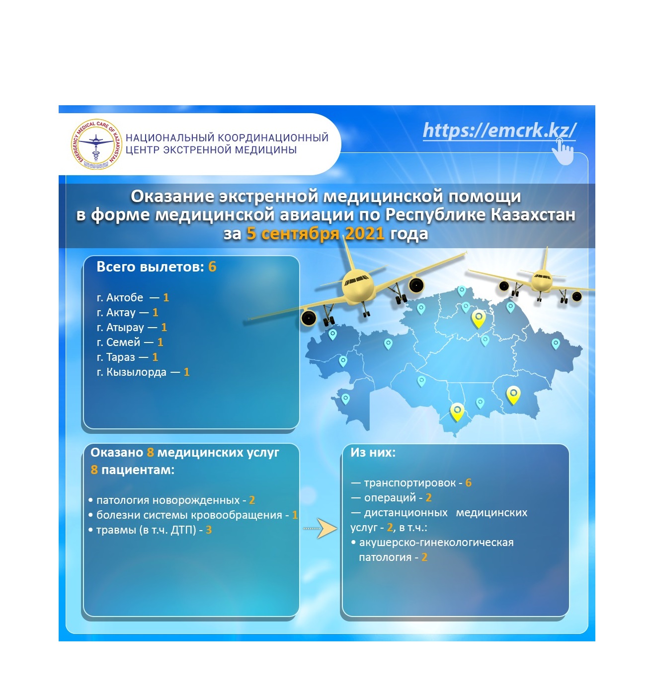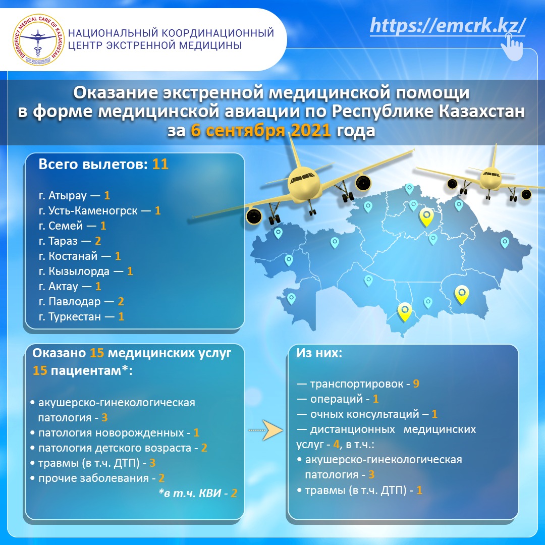Оказание экстренной медицинской помощи в форме медицинской авиации по Республике Казахстан за 6 сентября 2021 года