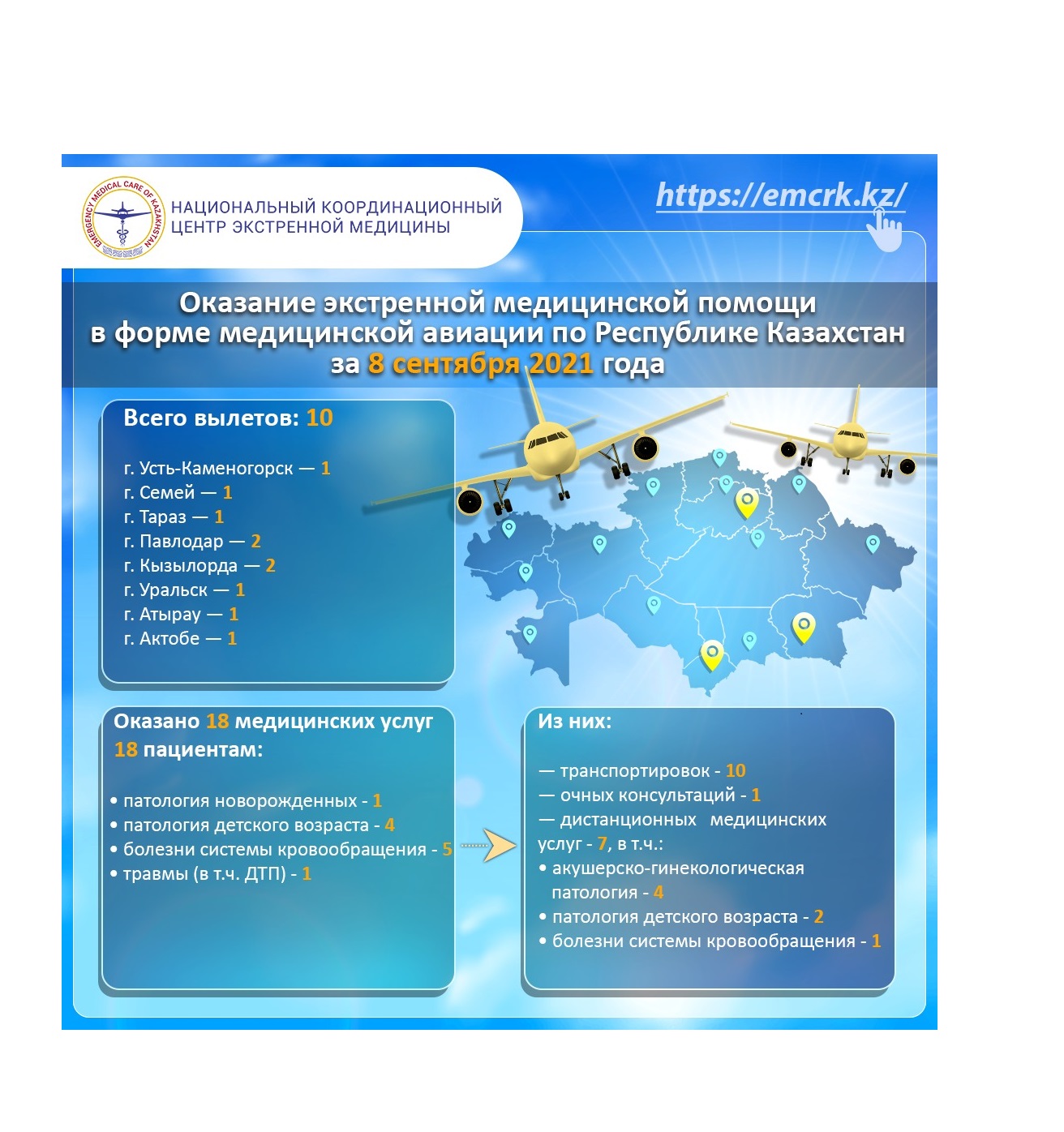 Оказание экстренной медицинской помощи в форме медицинской авиации по Республике Казахстан за 8 сентября 2021 года