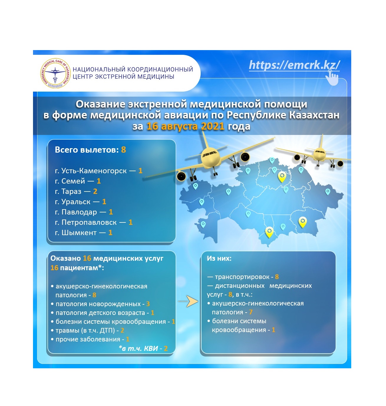 Оказание экстренной медицинской помощи в форме медицинской авиации по Республике Казахстан за 16 августа 2021 года