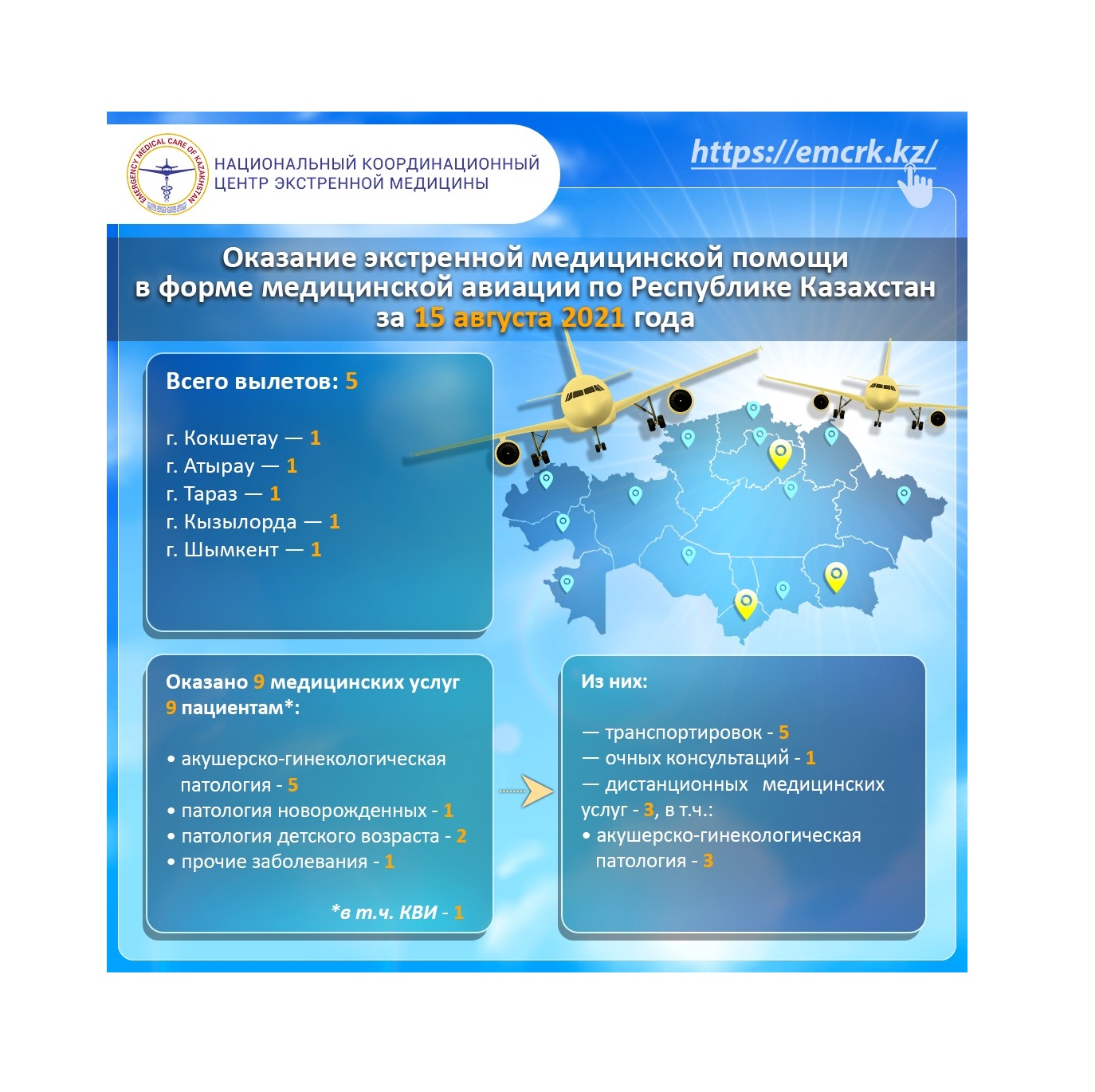 Оказание экстренной медицинской помощи в форме медицинской авиации по Республике Казахстан за 15 августа 2021 года