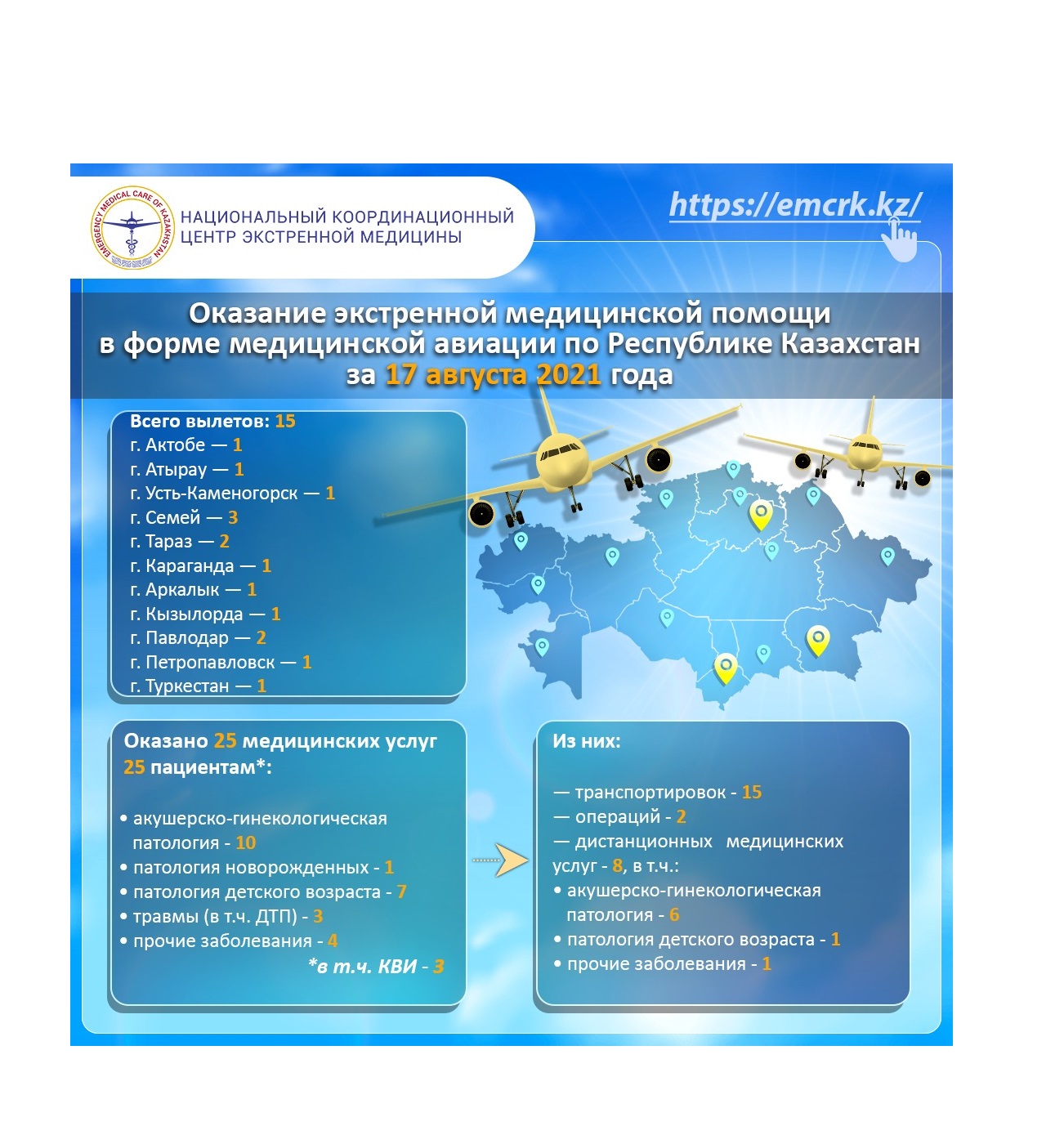Оказание экстренной медицинской помощи в форме медицинской авиации по Республике Казахстан за 17 августа 2021 года