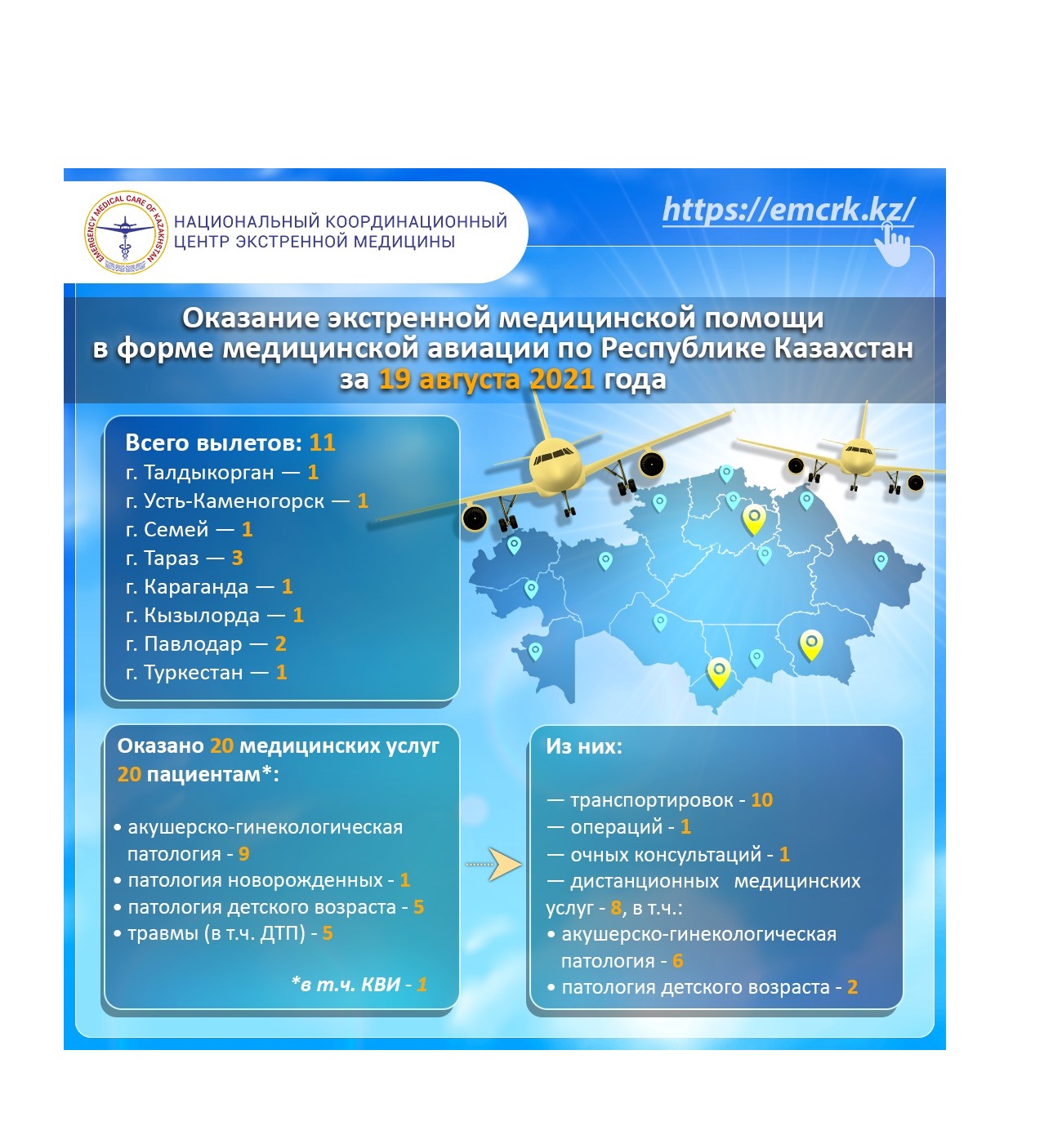 Оказание экстренной медицинской помощи в форме медицинской авиации по Республике Казахстан за 19 августа 2021 года