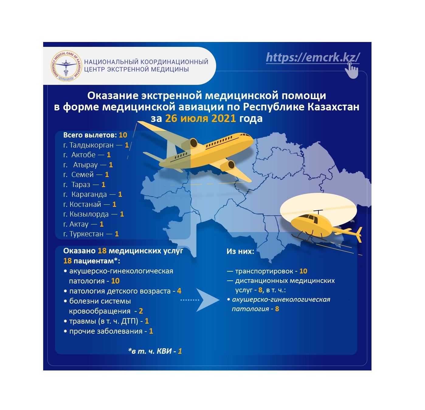Оказание экстренной медицинской помощи в форме медицинской авиации по Республике Казахстан за 26 июля 2021 года