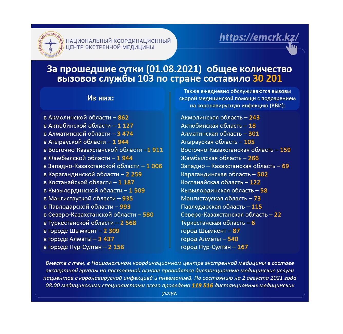 За прошедшие сутки (01.08.2021) общее количество вызовов службы 103 по стране составило 30 201